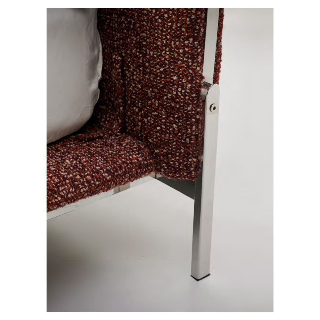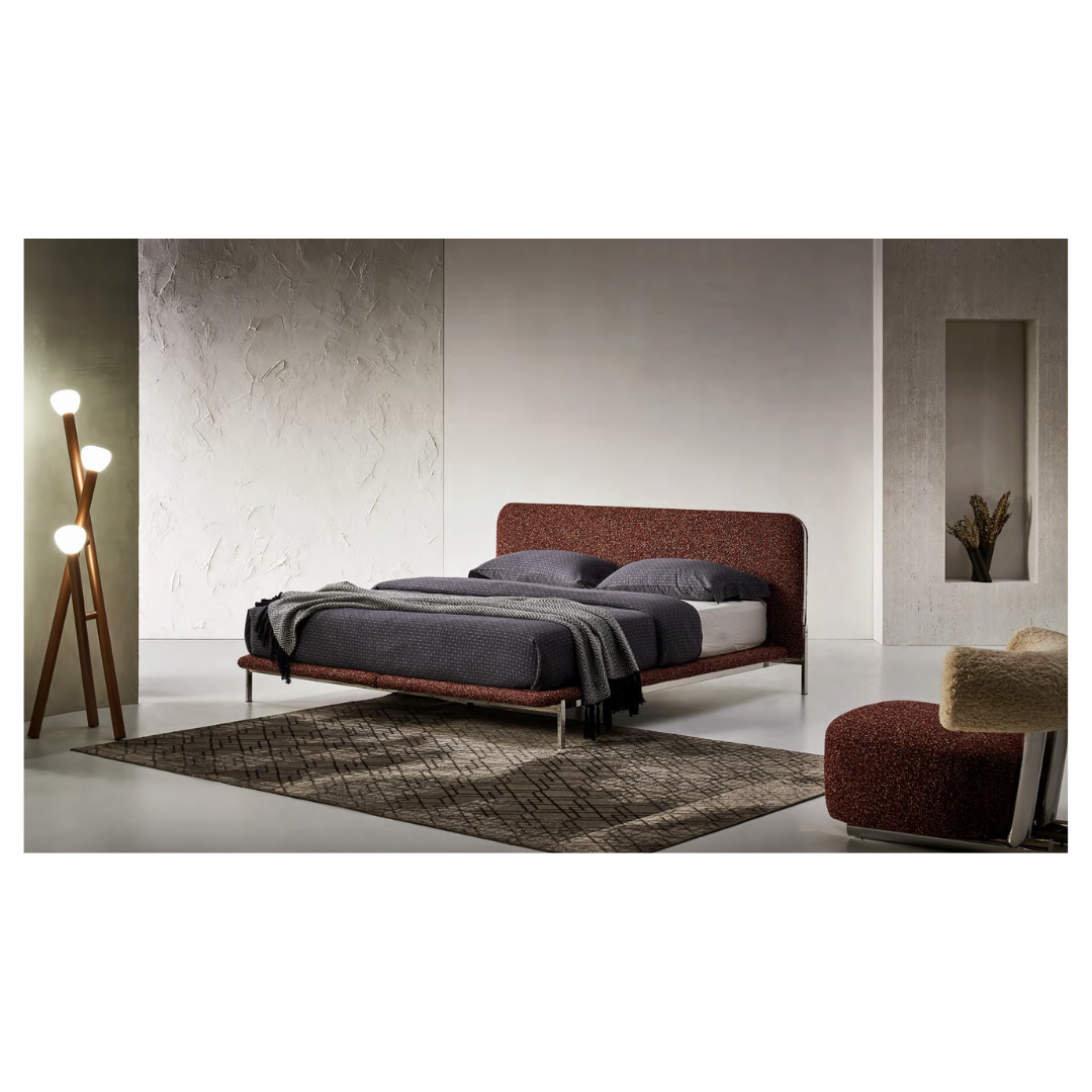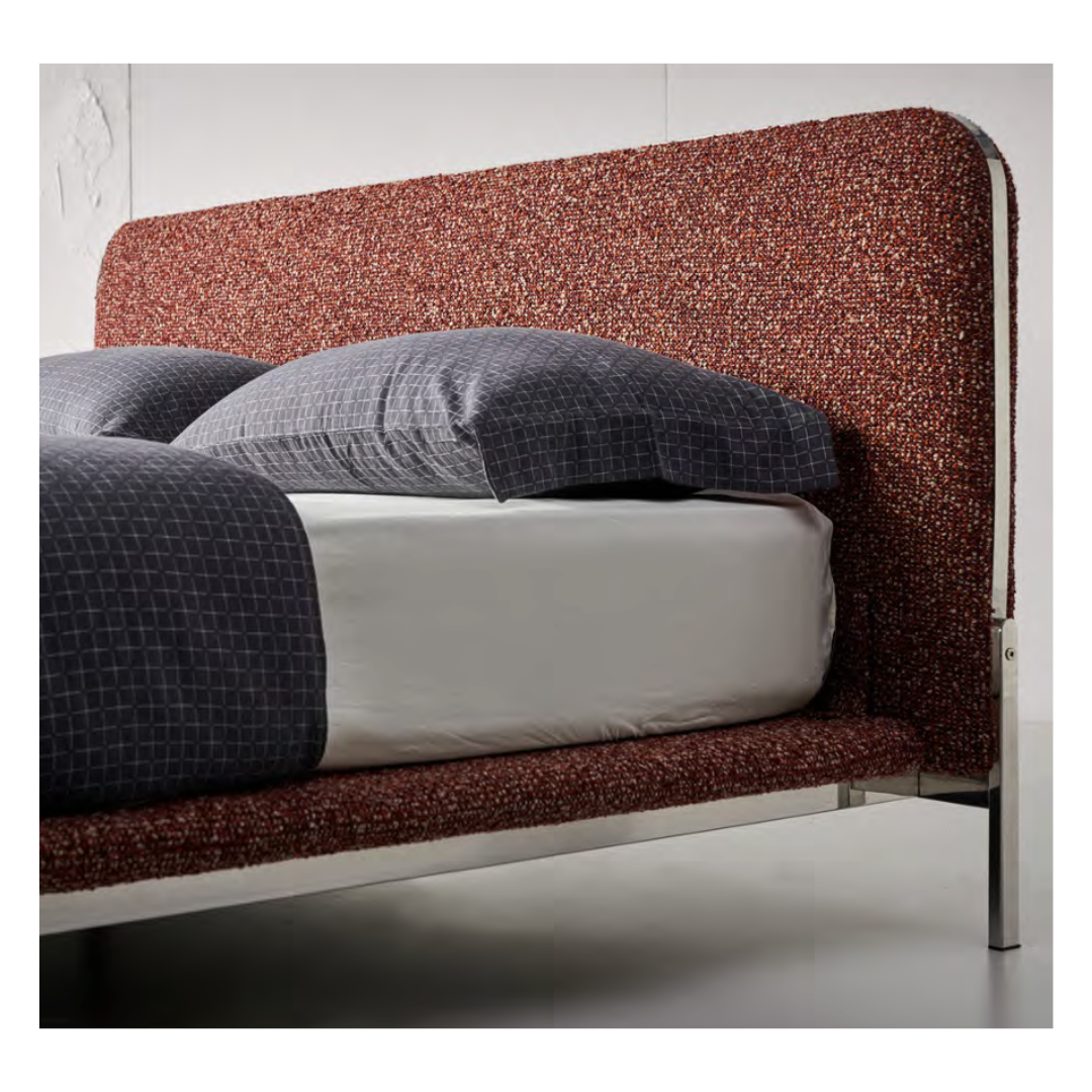 This bed exudes warmth and modern elegance with its upholstered headboard in a rich brick red textured fabric, creating a bold yet inviting focal point in any bedroom. The deep, earthy hue adds a touch of sophistication, while the luxurious texture offers both visual interest and comfort. Complementing the headboard, the polished chrome legs and frame introduce a sleek, contemporary element, elevating the bed’s overall design. The fusion of soft upholstery and sharp metallic accents makes this bed a stunning combination of coziness and modern flair, perfect for those seeking both style and comfort in their bedroom retreat.