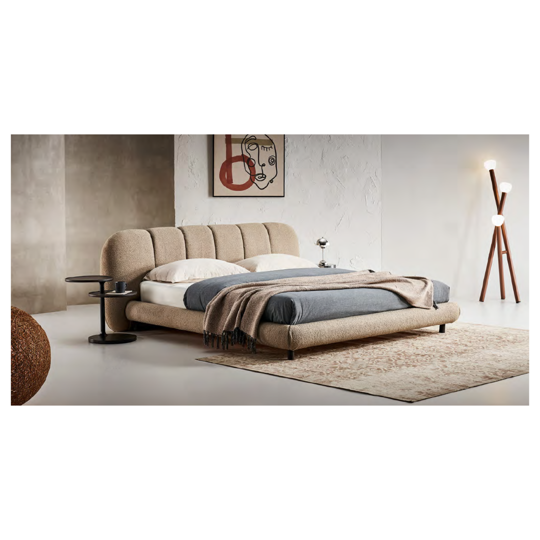 This bed is a harmonious blend of sophistication and comfort, featuring an upholstered headboard and sideboards adorned with linear tufting and elegantly curved edges. The gentle curves create a soft, inviting silhouette that contrasts beautifully with the clean lines of the tufting, offering a modern yet timeless look. The luxurious upholstery adds texture and warmth to any bedroom, while the meticulously crafted details bring a sense of refinement and elegance. This bed is designed not only for restful sleep but also to be a statement piece in your bedroom, exuding both style and comfort.