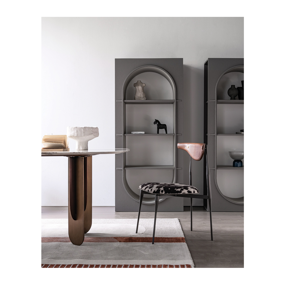 The Arcadia Dining Table features a luxurious stone top with sleek legs that showcase gracefully curved edges. This elegant design blends modern sophistication with subtle curves, creating a stylish and functional centerpiece for any dining area.