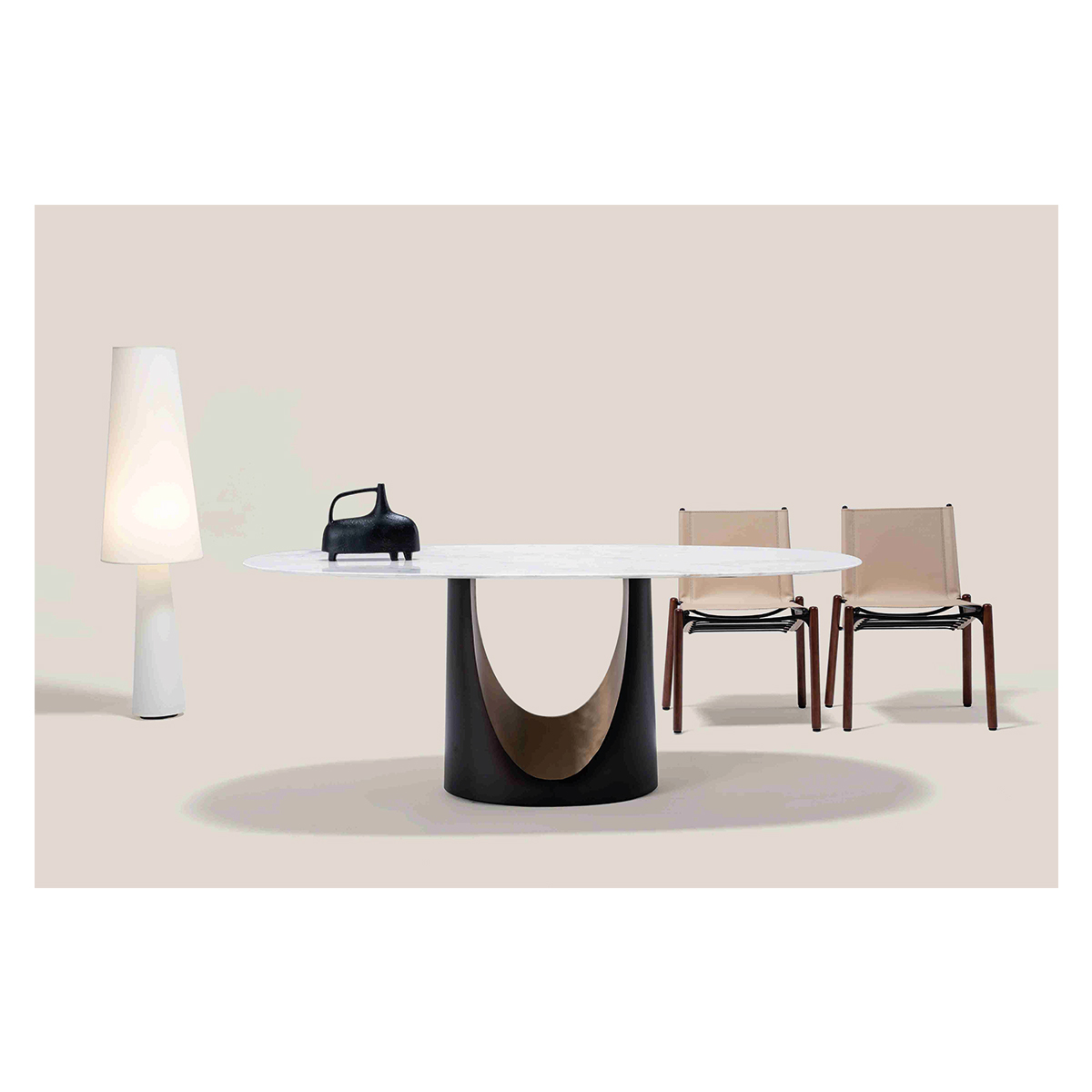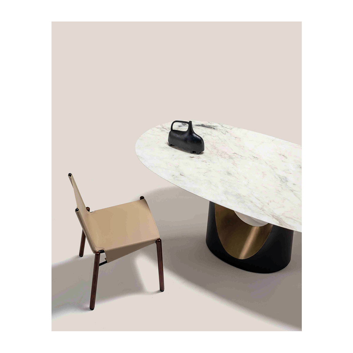 Slate showcases a striking stone top supported by a sleek metal frame and legs. Its modern design merges the natural elegance of stone with the clean lines of metal, making it a perfect centerpiece for any stylish dining area.