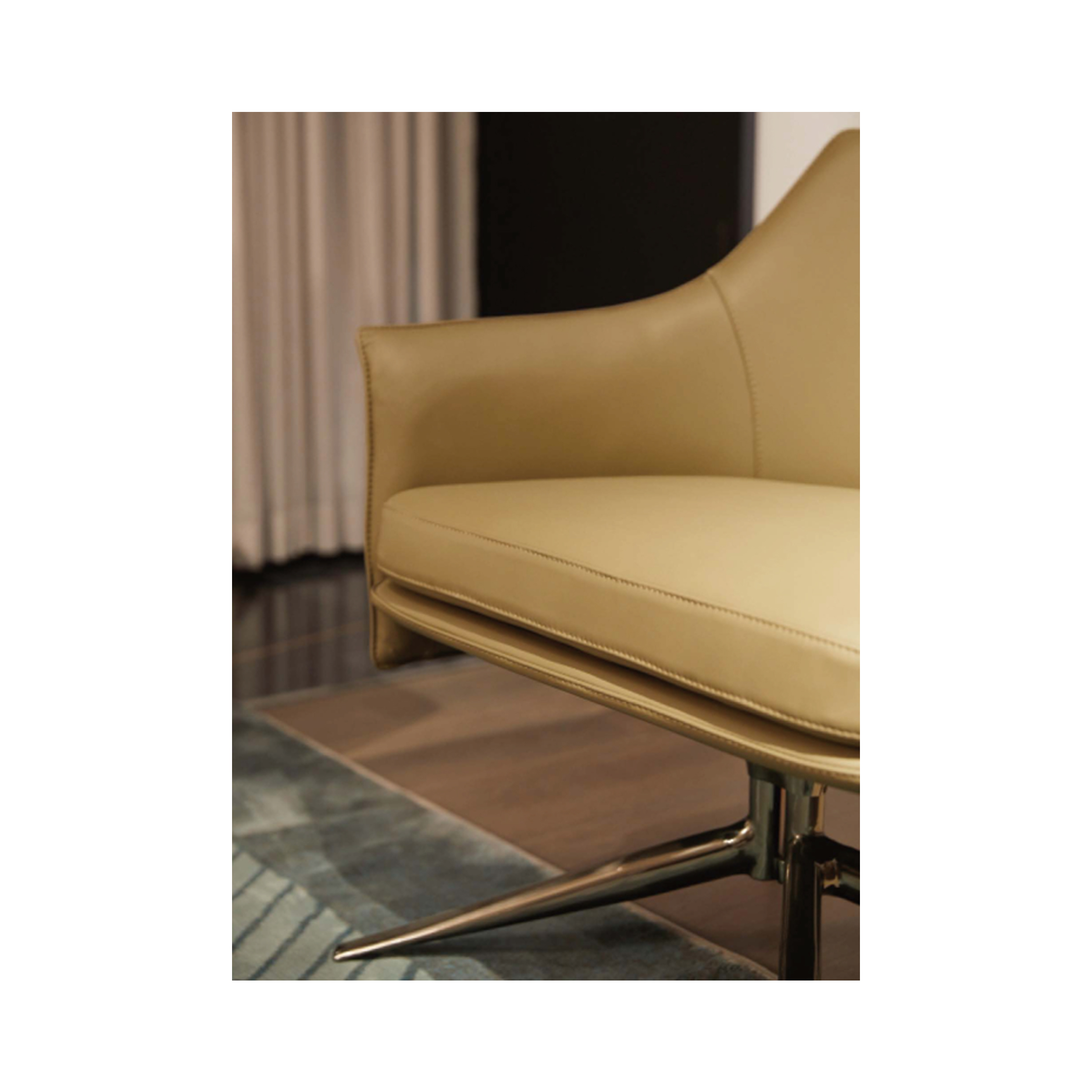 The Grun armchair brings a touch of elegance and sophistication to any space with its sleek design and rich olive upholstery. This contemporary chair features clean lines and a minimalist silhouette, making it a perfect accent piece for modern or transitional interiors. The plush cushioning provides exceptional comfort, inviting you to sink in and relax, whether you’re reading a book, enjoying a cup of coffee, or hosting friends.