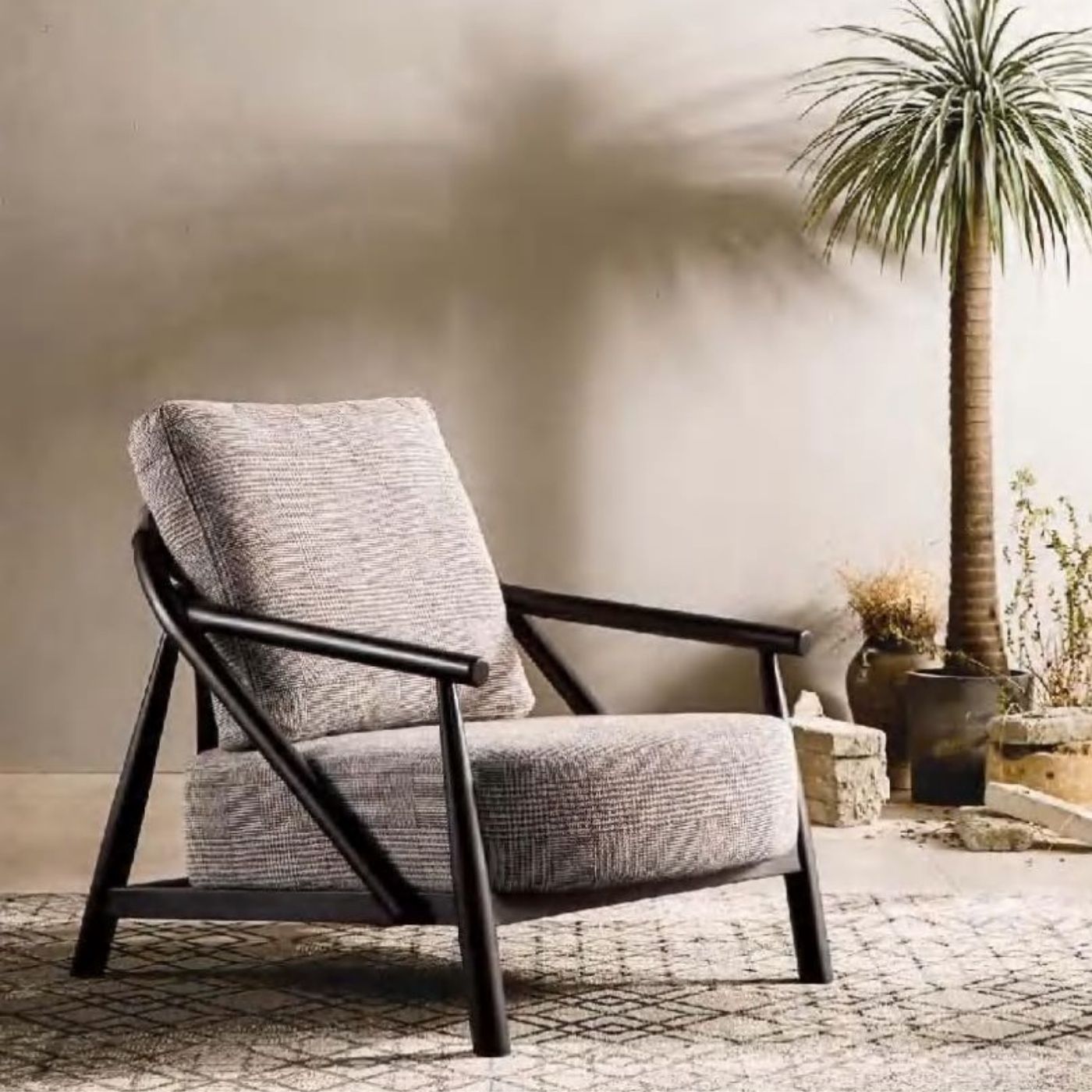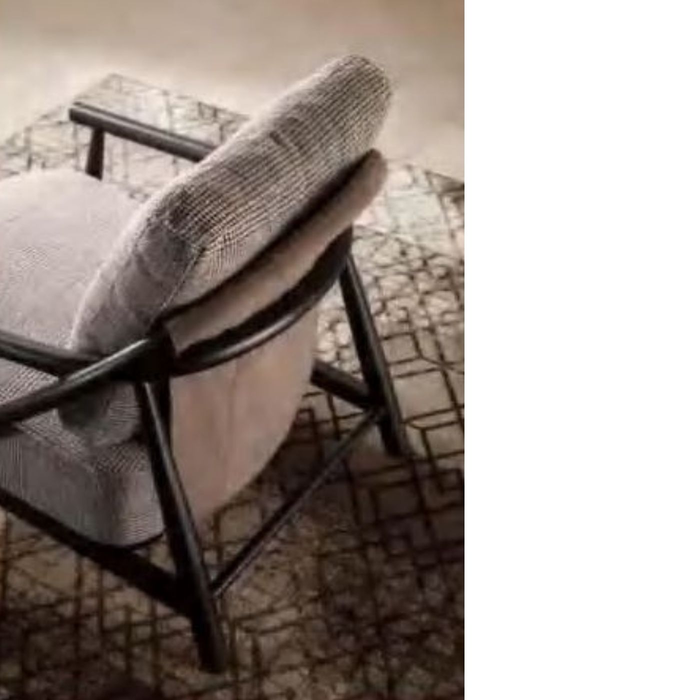 This armchair exudes modern sophistication, featuring black textured fabric that adds depth and a tactile dimension to its design. The shaped metal frames offer a sculptural, contemporary feel, with smooth curves and sleek lines that enhance the overall aesthetic. The contrast between the soft fabric and the strong, industrial-inspired metal creates a dynamic balance, making this armchair a focal point in any space. Perfect for modern living rooms, offices, or lounges, it combines comfort with artistry, bringing a bold yet refined touch to your decor. Designed to stand out, this piece elevates any room with its striking form and luxurious texture.