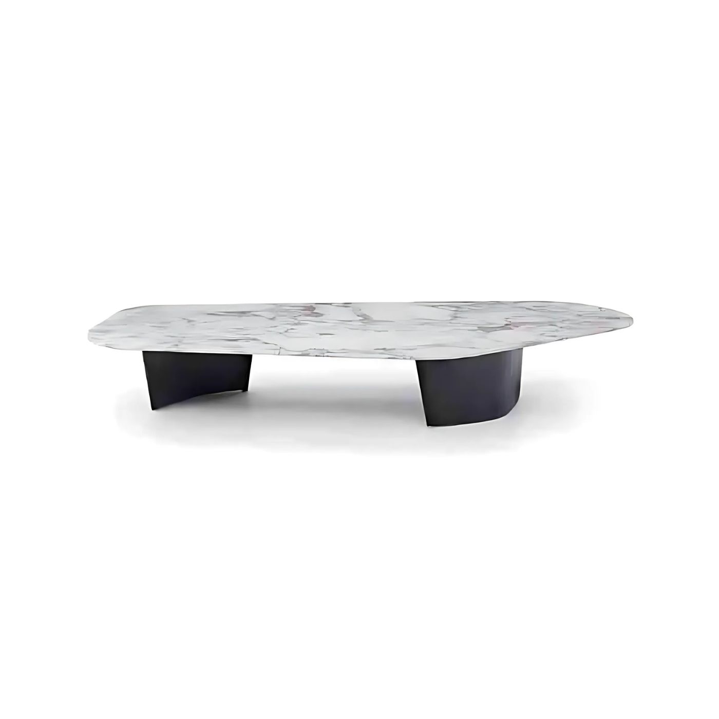 This coffee table showcases a stunning organic-shaped marble top, its natural contours and unique veining creating a one-of-a-kind piece that exudes timeless beauty. The two metal legs, sleek and minimal, provide a modern contrast to the marble, offering stability while maintaining a light and airy feel. The combination of the soft, fluid form of the marble with the sharp, clean lines of the metal legs embodies the perfect balance between nature and modern design. Aria is a sophisticated addition to any living space, blending artistry with functionality to create a striking focal point in your home.