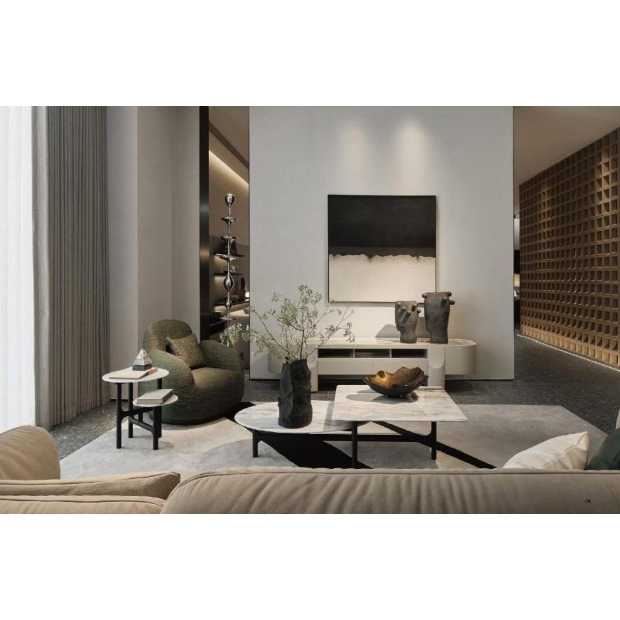 Design concept:The “BiFu”coffee table has a vertical marble tabletop supported by slender conical legs.The balance betweenstructure and tension,between warmthand rebelion,gives you a sense of contemporary fashion;the arc with a square in the circle gives you a warm touch between your fingers,adding a clear arc to the space.The rise and fal,the still ness and the movement,interpret the artistic conception with the silhouette,which emerges in an instant and makes you