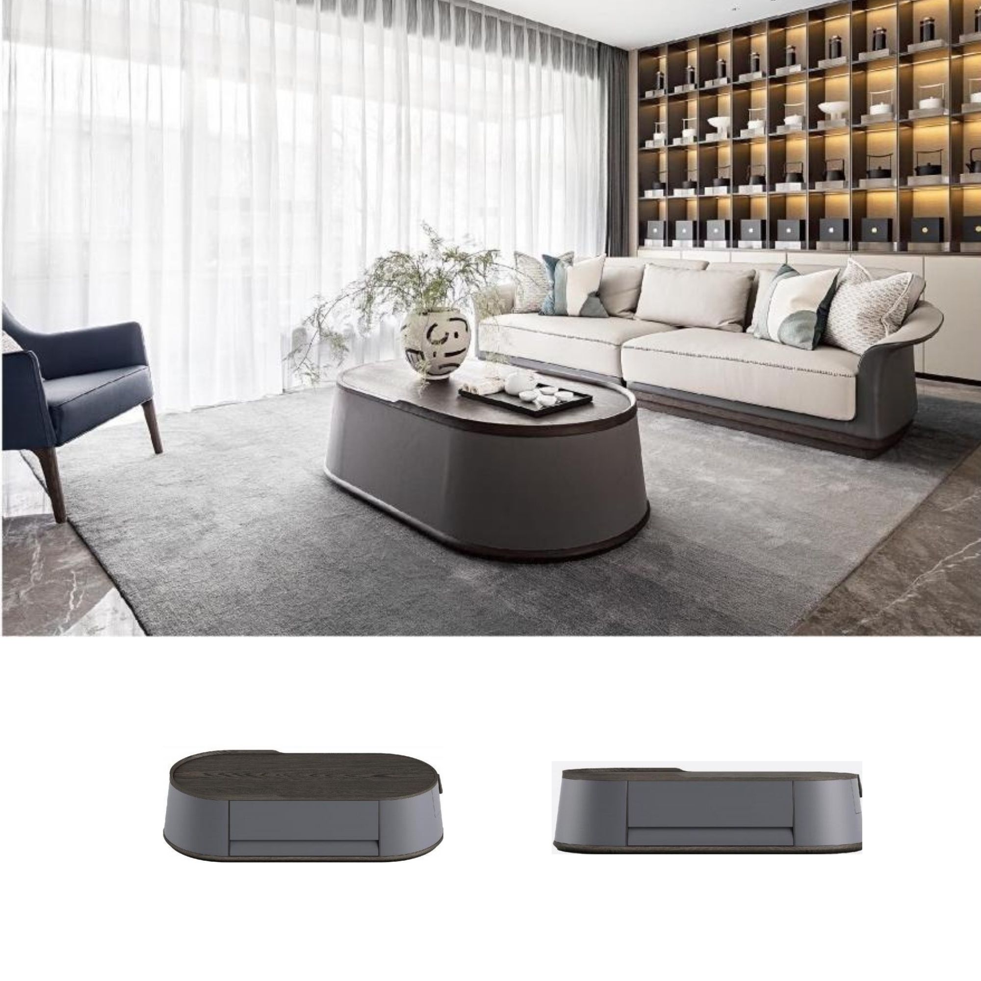 Designconcept:The oval trapezoidal appearance is roundand solemn.The combination of gray oak and saddle leather is like ajade pendant in a brocade bag.The gentleman’s way has the beauty of simplicity,low-key and not gorgeous.Wood issimple and jade is round.The overall coffee table makes good use of the two materials.The solid wood on the left is just like gold inlaid withjade,which increases the layering of the coffee table and adds more imagination space for the extension of lines.