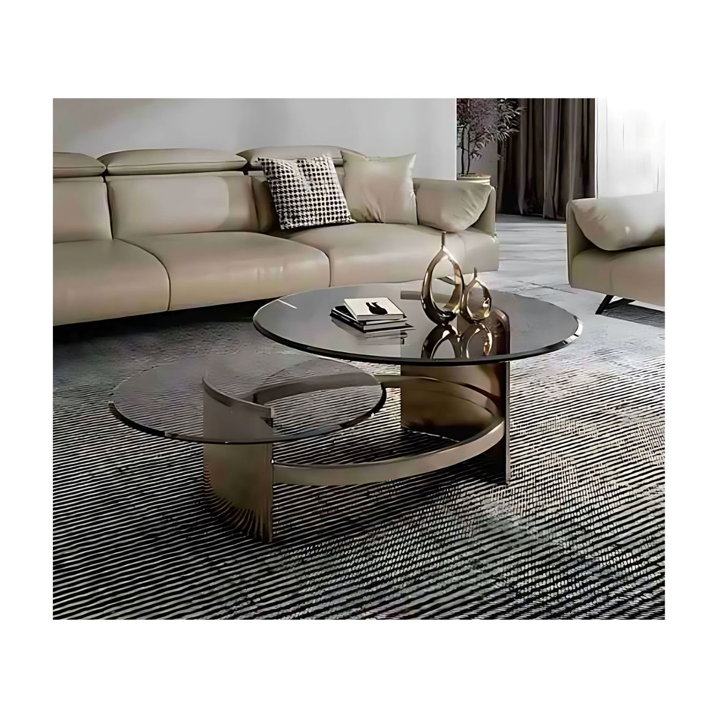This exquisite coffee table features multiple round glass tops, each set at varying heights, creating a dynamic and visually intriguing design. The transparent glass surfaces offer an airy, open feel, allowing for seamless integration into any living space while showcasing the beauty of surrounding décor. The brushed gold-finish base adds a touch of elegance, with its warm metallic tones providing a sophisticated contrast to the sleek glass. Perfectly blending function and form, this table not only serves as a practical centerpiece but also as a statement of modern design, offering both versatility and timeless style.