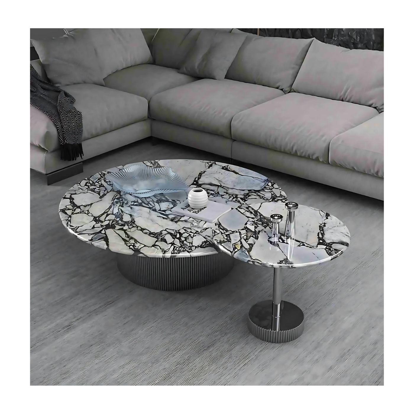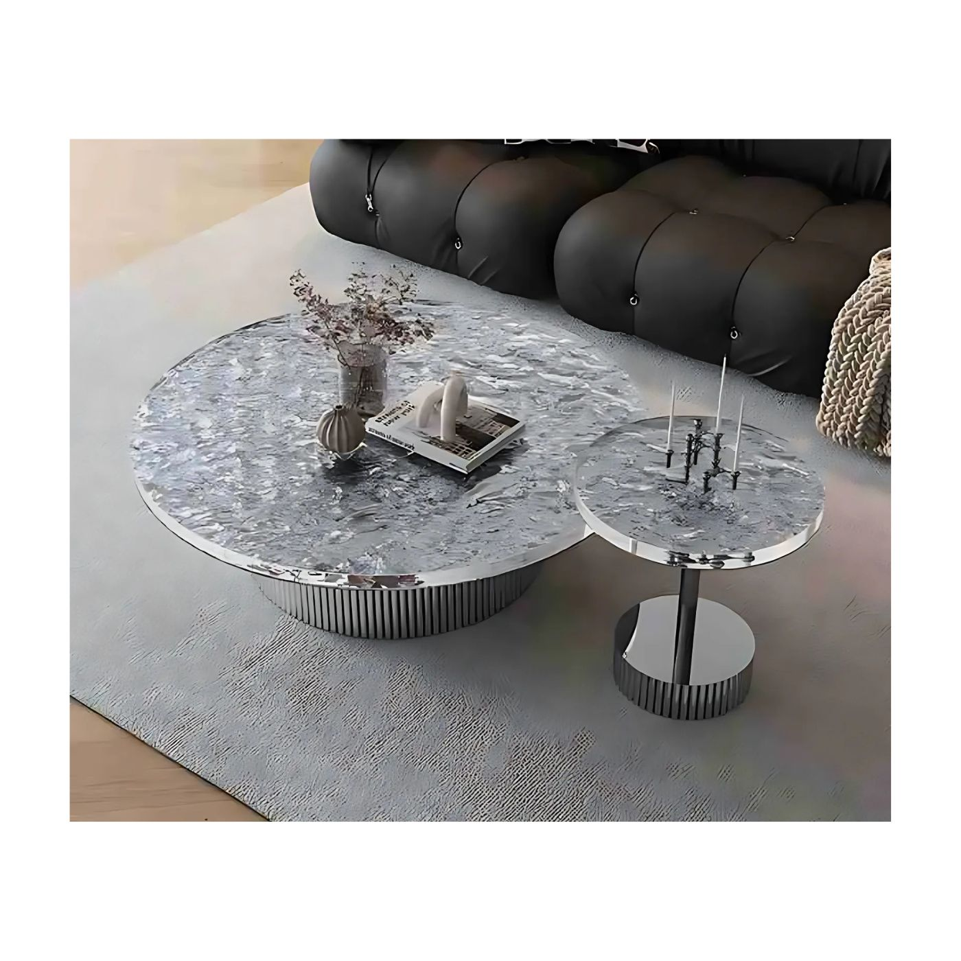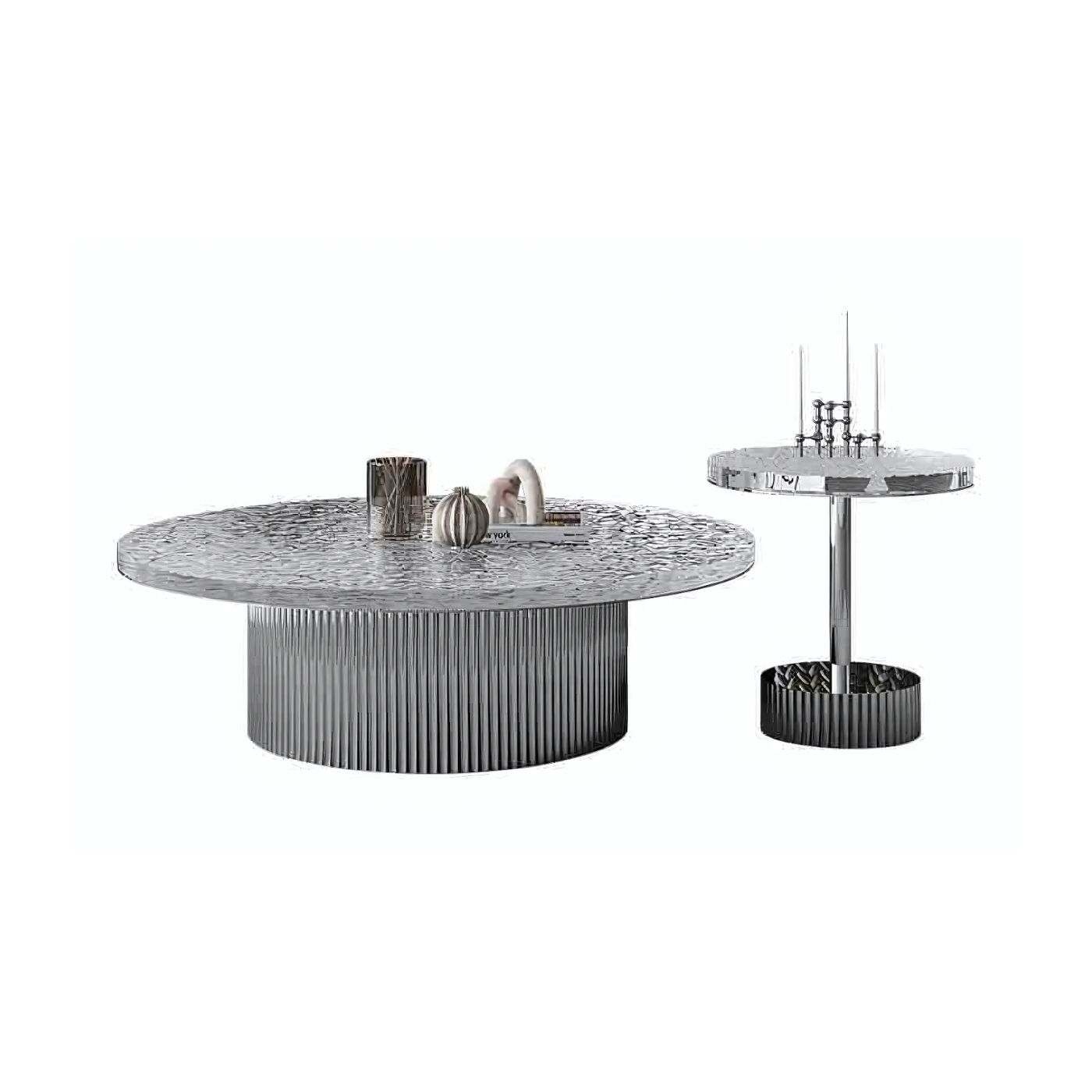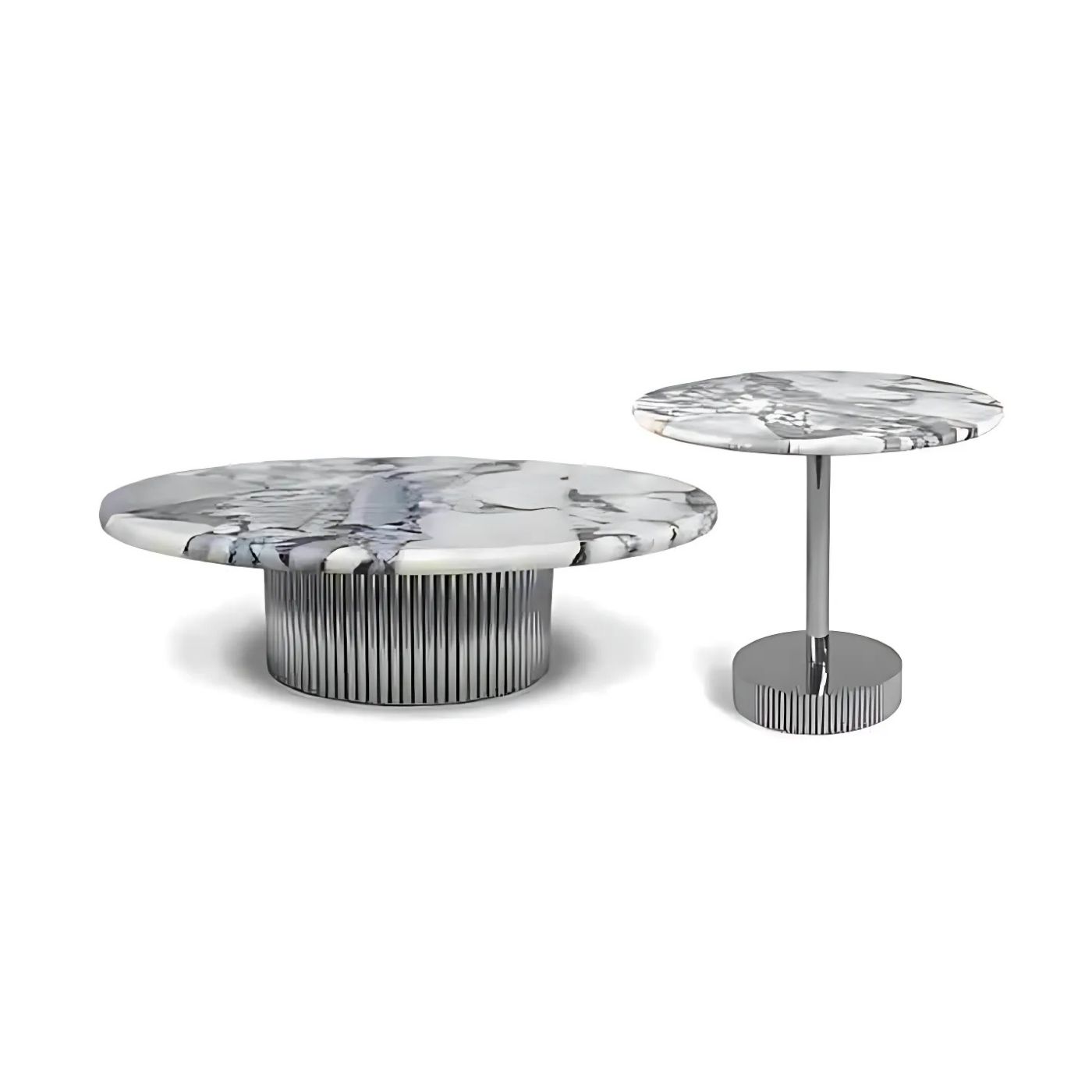 This set of coffee tables features an exquisite blend of modern elegance and timeless luxury. The stainless steel bases are adorned with a stunning fluted design, adding texture and visual interest to the tables. The sleek, polished metal contrasts beautifully with the rich marble tops, each showcasing unique veining that enhances its natural beauty. Raffinare is a perfect example of sophisticated craftsmanship, offering a luxurious touch that elevates any space. The combination of marble and fluted stainless steel brings both artistry and functionality, making it an ideal centerpiece for contemporary or classic interiors.