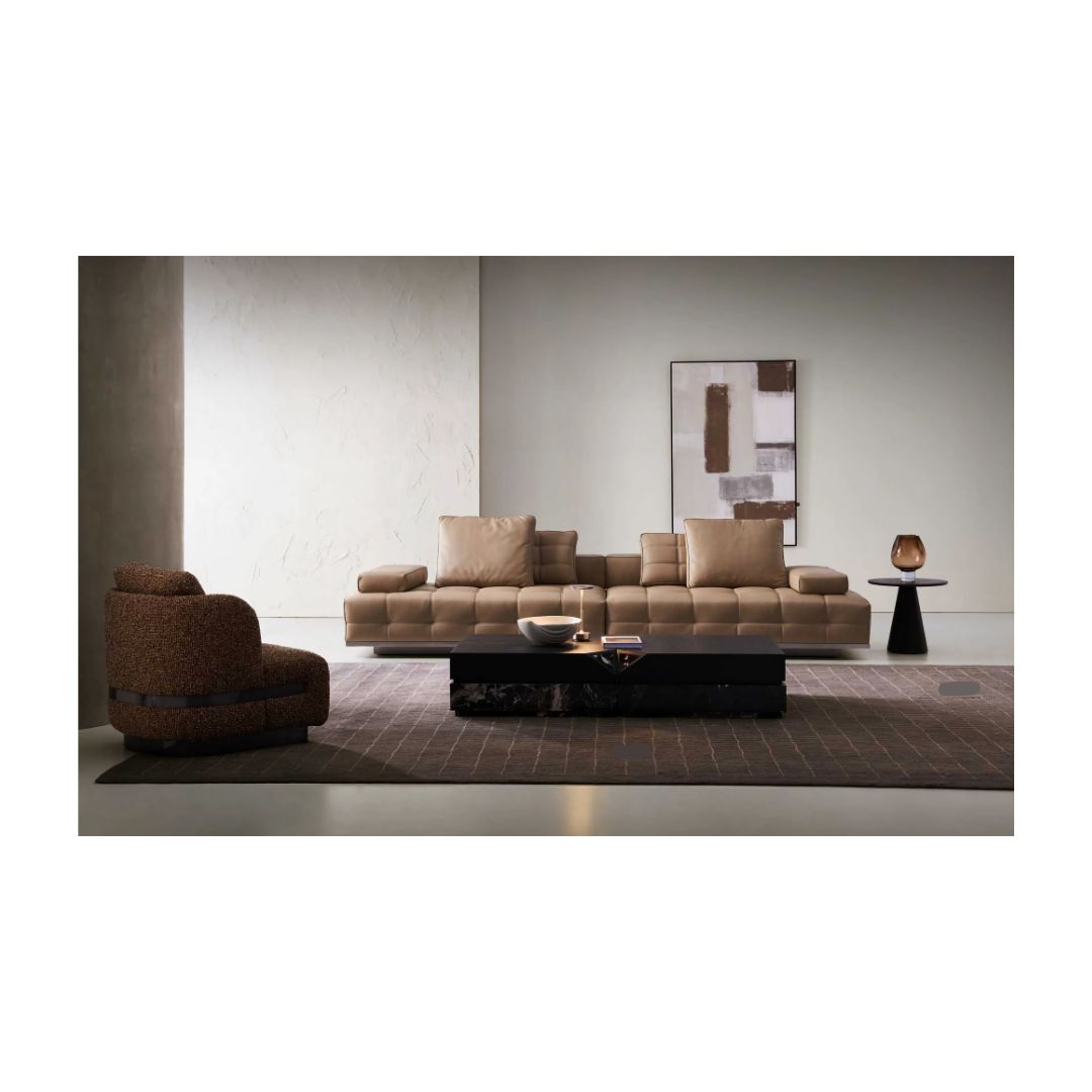 This stunning coffee table features a distinctive chamfered edge and a unique stone top, offering a perfect blend of modern design and natural elegance. The smooth, angled edges create a sleek, refined silhouette, while the stone surface showcases intricate patterns and textures, making each piece one-of-a-kind. Its bold yet sophisticated aesthetic makes it a true statement piece for any living room or lounge area. The combination of the geometric edge and the organic beauty of the stone makes this coffee table both functional and artistic, adding a sense of style and luxury to your space.