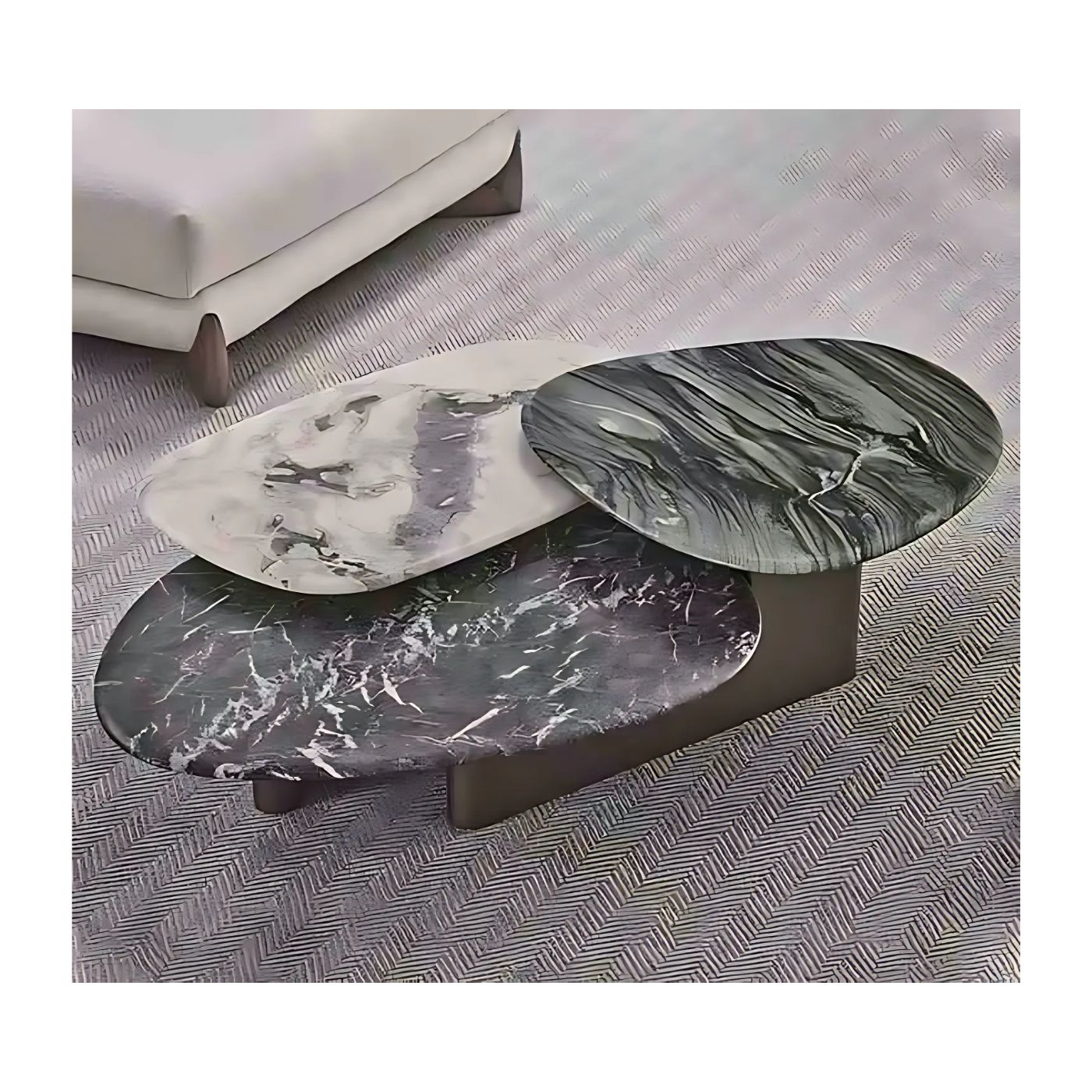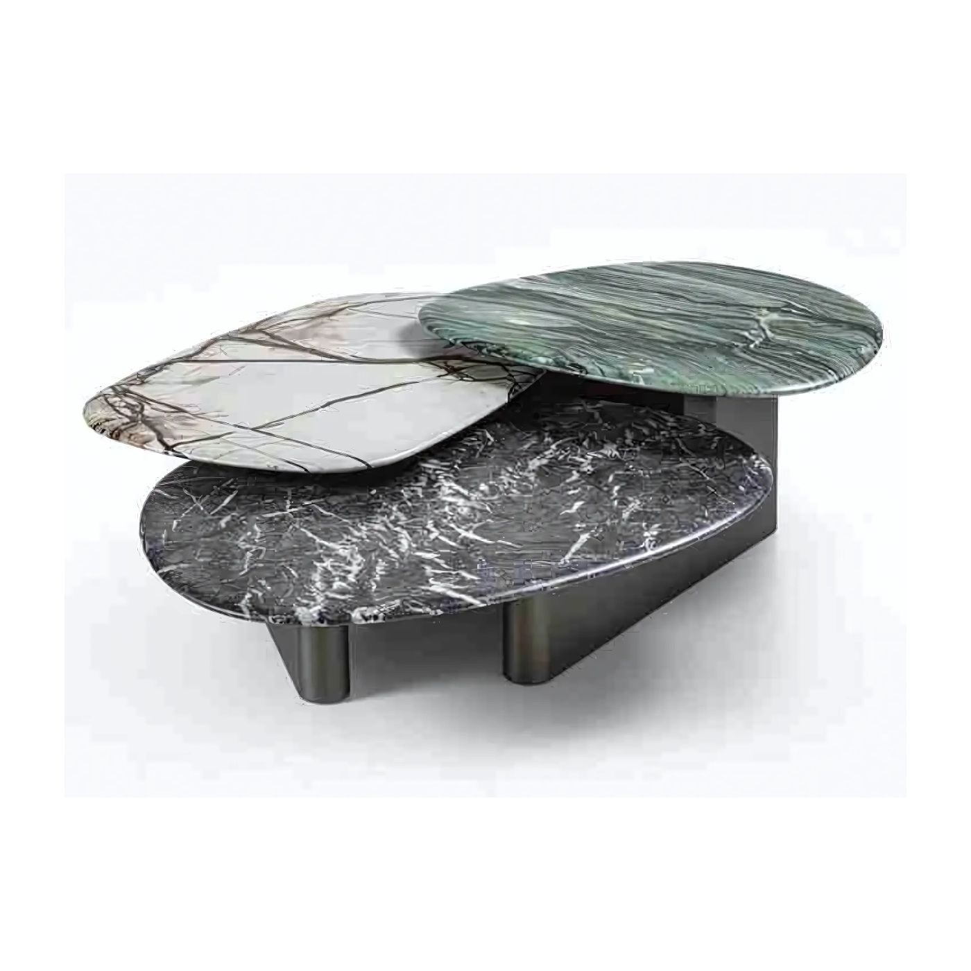 This coffee table is a striking fusion of form and function, featuring three organically shaped marble tabletops at varying heights. Each marble surface is unique, showcasing natural veining and patterns that add elegance and sophistication to any space. The multi-level design not only provides a dynamic visual effect but also enhances practicality, offering layered surfaces for both display and use. The Tier coffee table blends luxurious marble with artistic, fluid shapes, creating a captivating centerpiece that elevates modern living spaces with its harmonious balance of style and versatility.