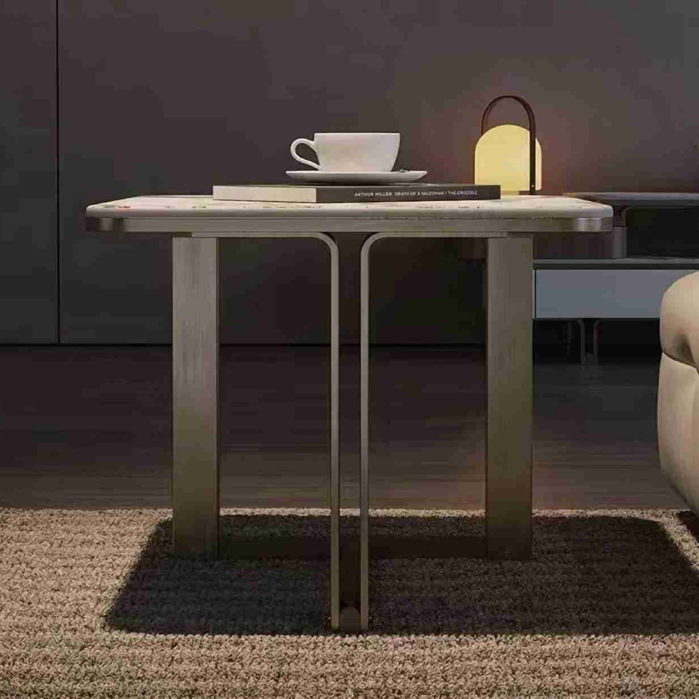 A standout piece, the Oryx Luxe-ET side table boasts rich materials and geometric accents, creating a striking focal point.
