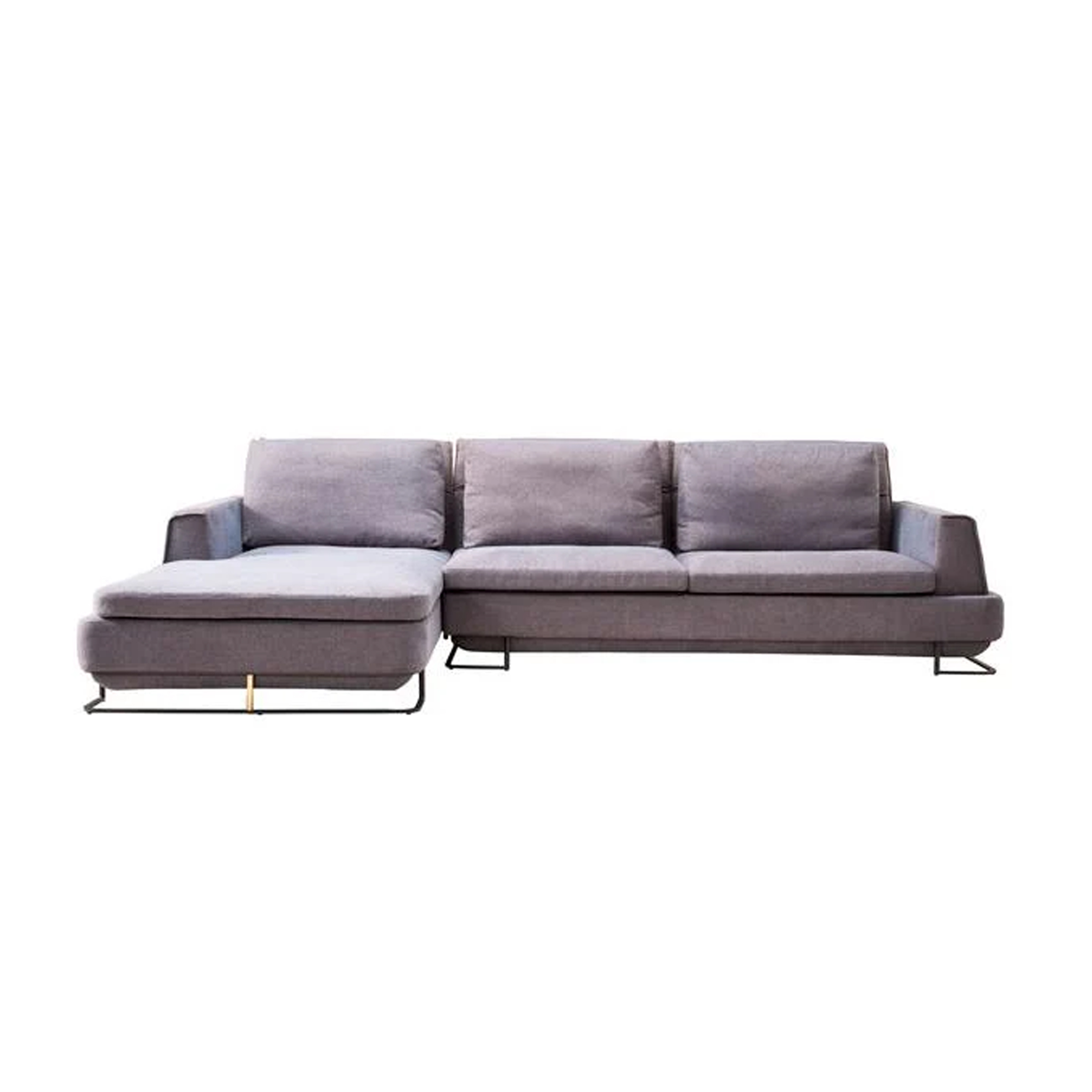 A sleek sectional sofa in rustic gray with slim metal legs, blending contemporary style with a touch of industrial charm for a refined, modern look.