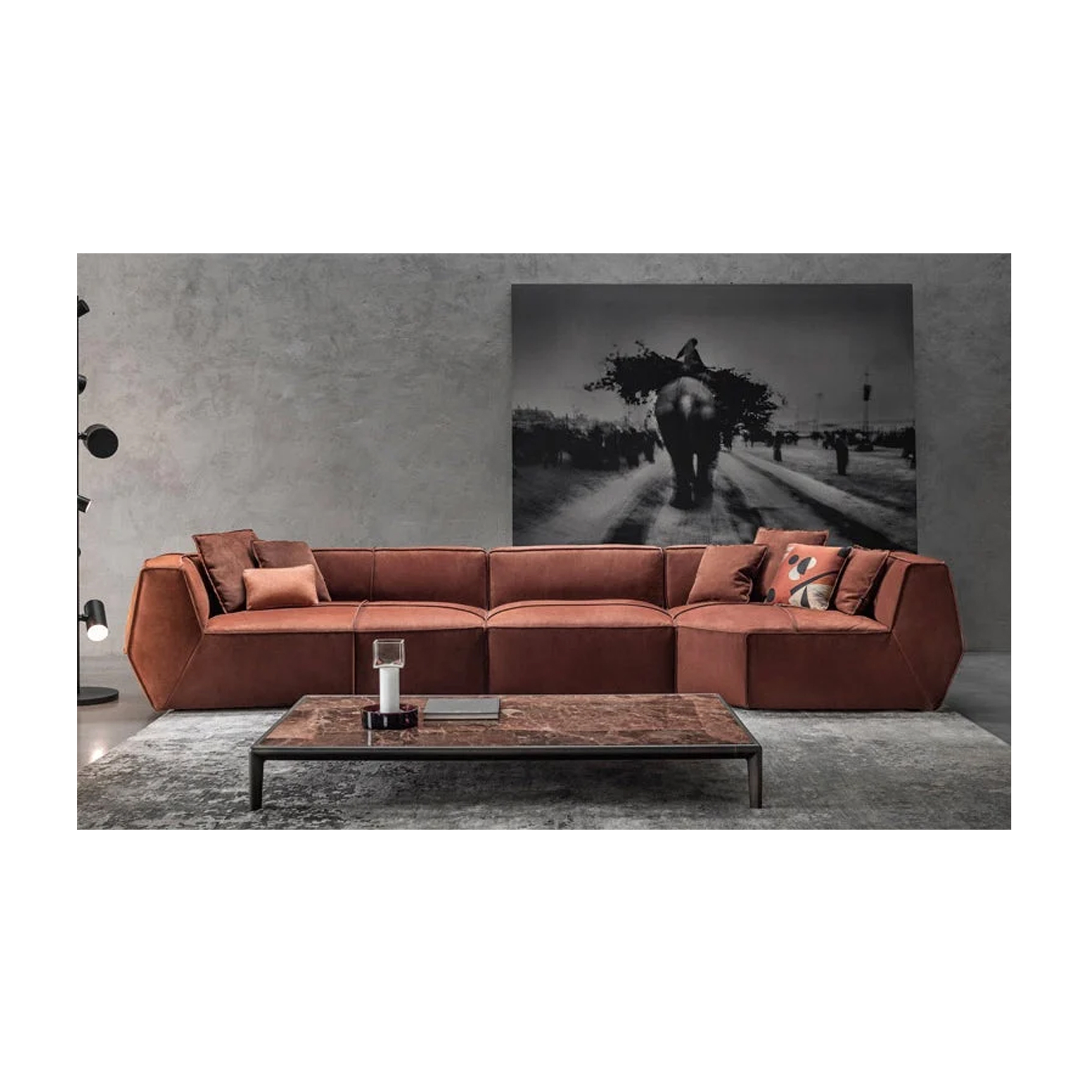 A striking sectional sofa in rich brick red, designed to add warmth and elegance to any space while providing ample seating and plush comfort.