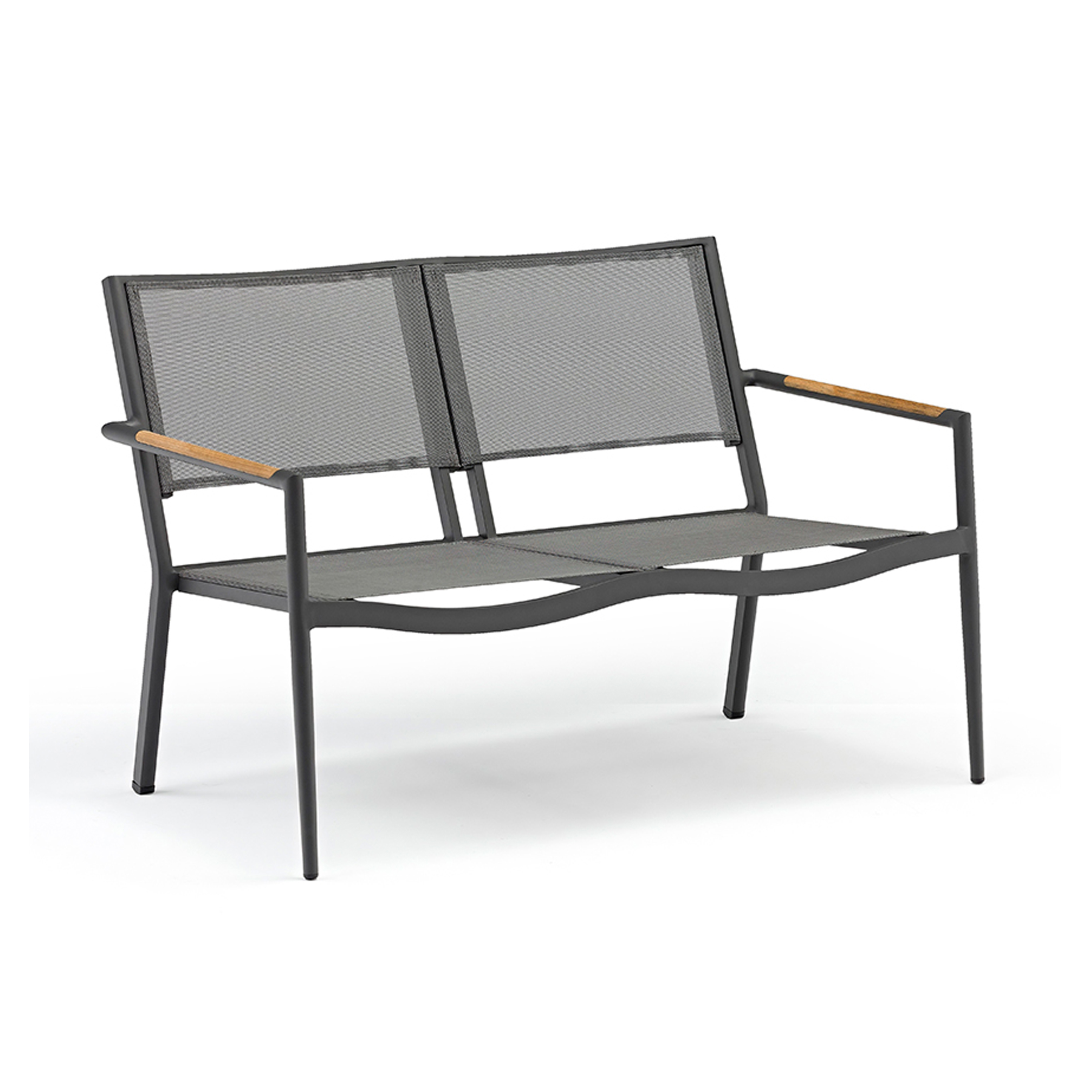 Sleek outdoor sofa in black metal, offering a modern and minimalist design with durable construction for a sophisticated outdoor space.