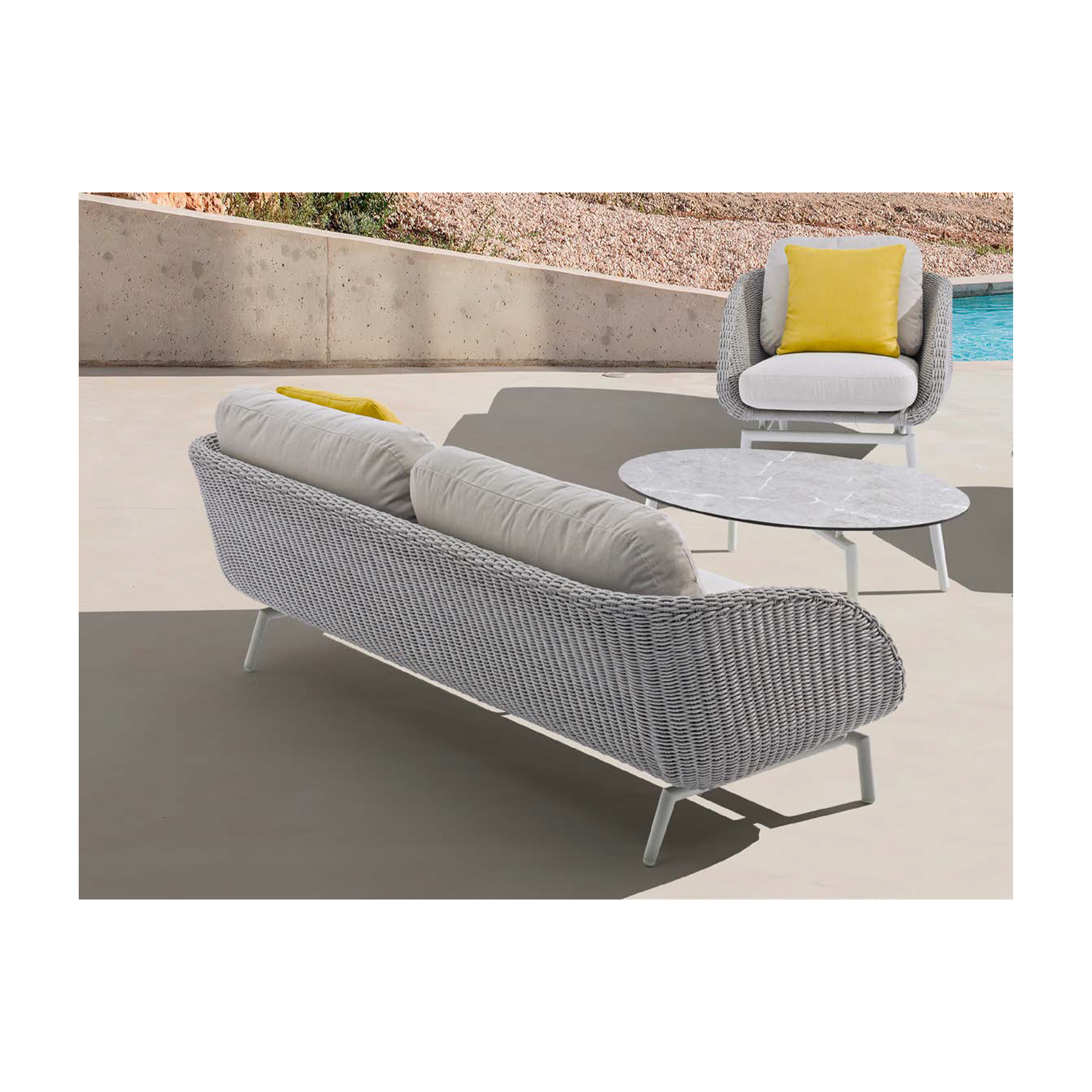 The Twilight Sectional Outdoor Sofa combines elegant appeal with a cozy retreat. Its sophisticated design and plush cushions create a charming and inviting outdoor seating area.