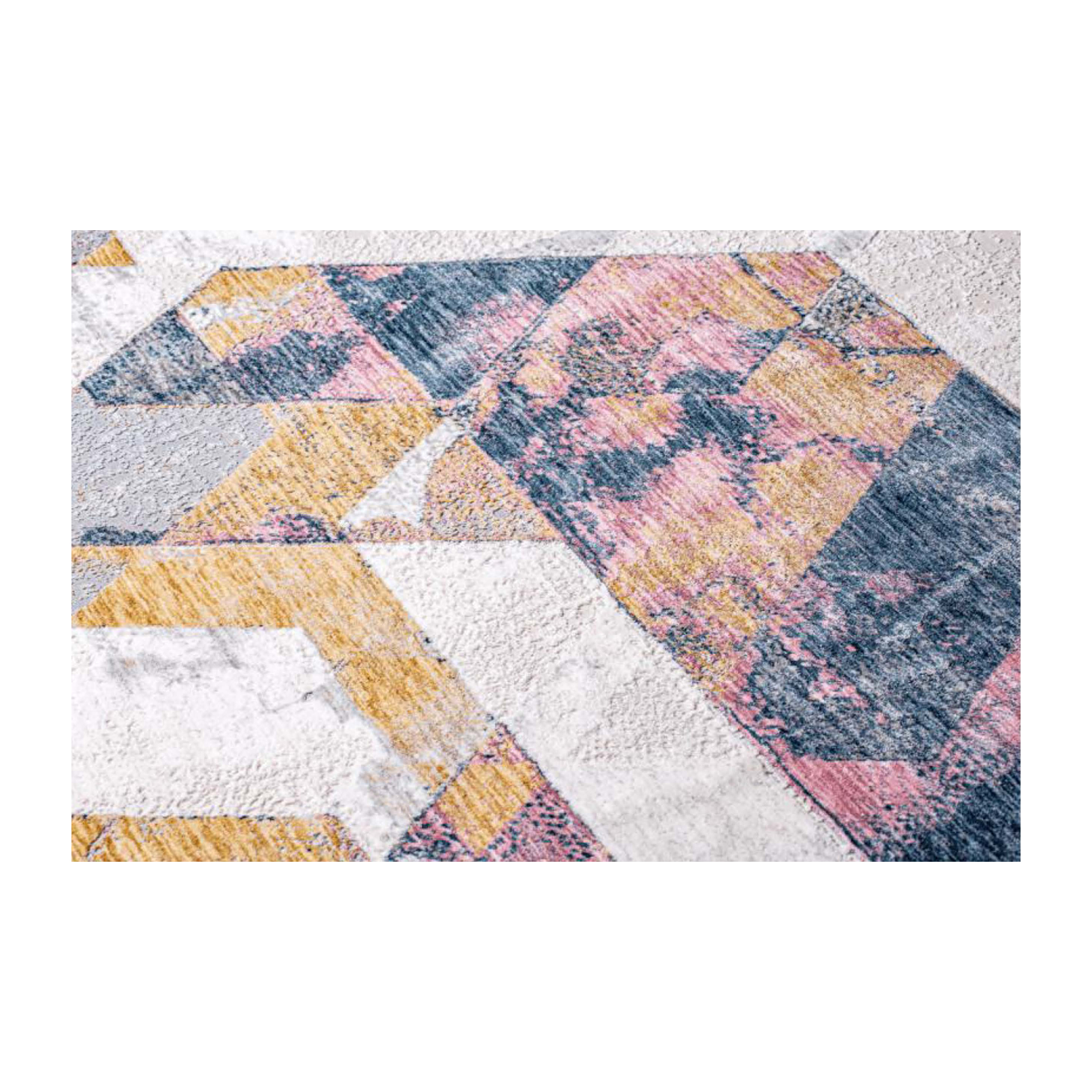 A vibrant rug featuring peach, blue, and ivory colors with a cubist design, blending bold geometric shapes and a refreshing color palette to bring a modern and artistic touch to your space.