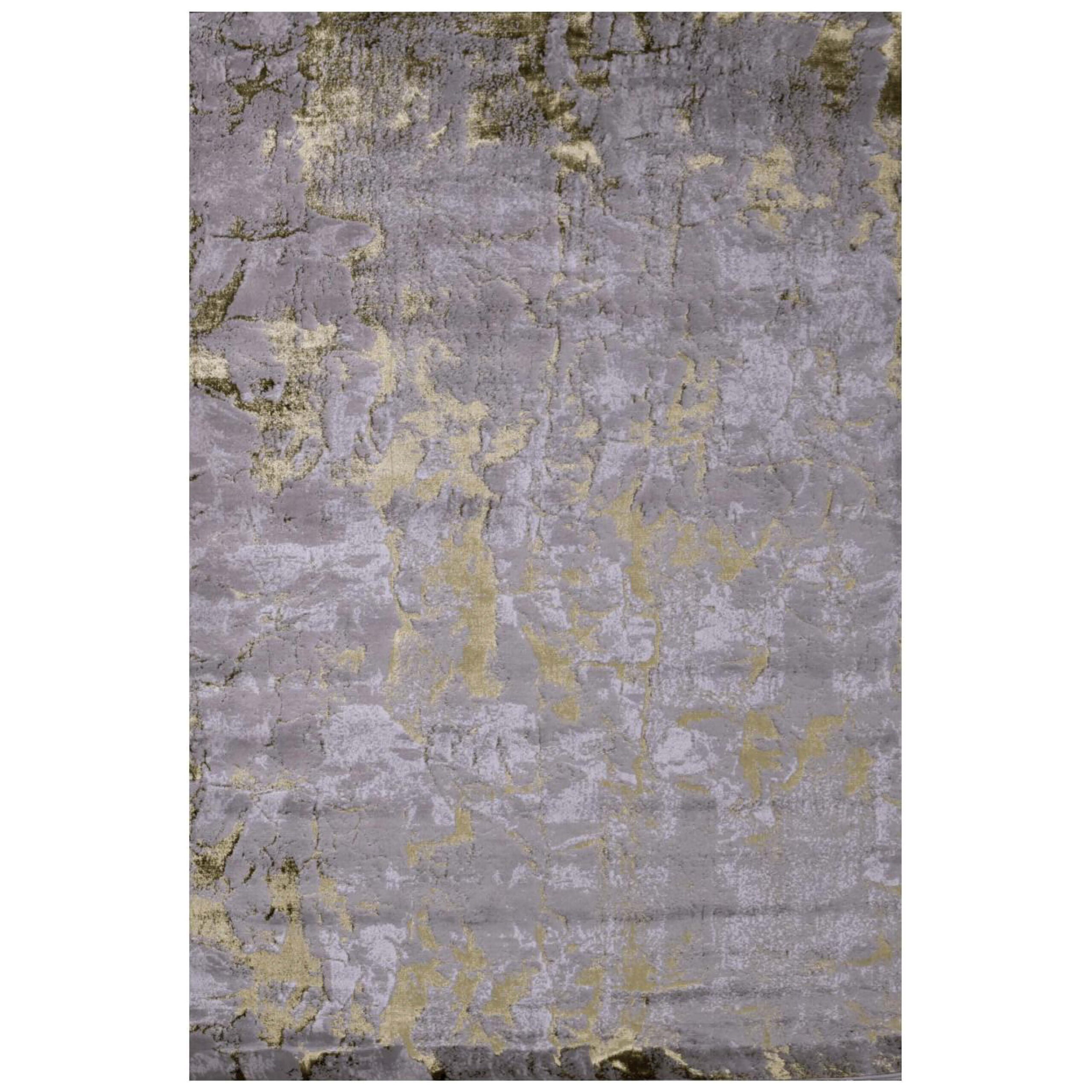 A sophisticated rug adorned with a subtle gold shimmer, offering a touch of elegance and sparkle to any room.