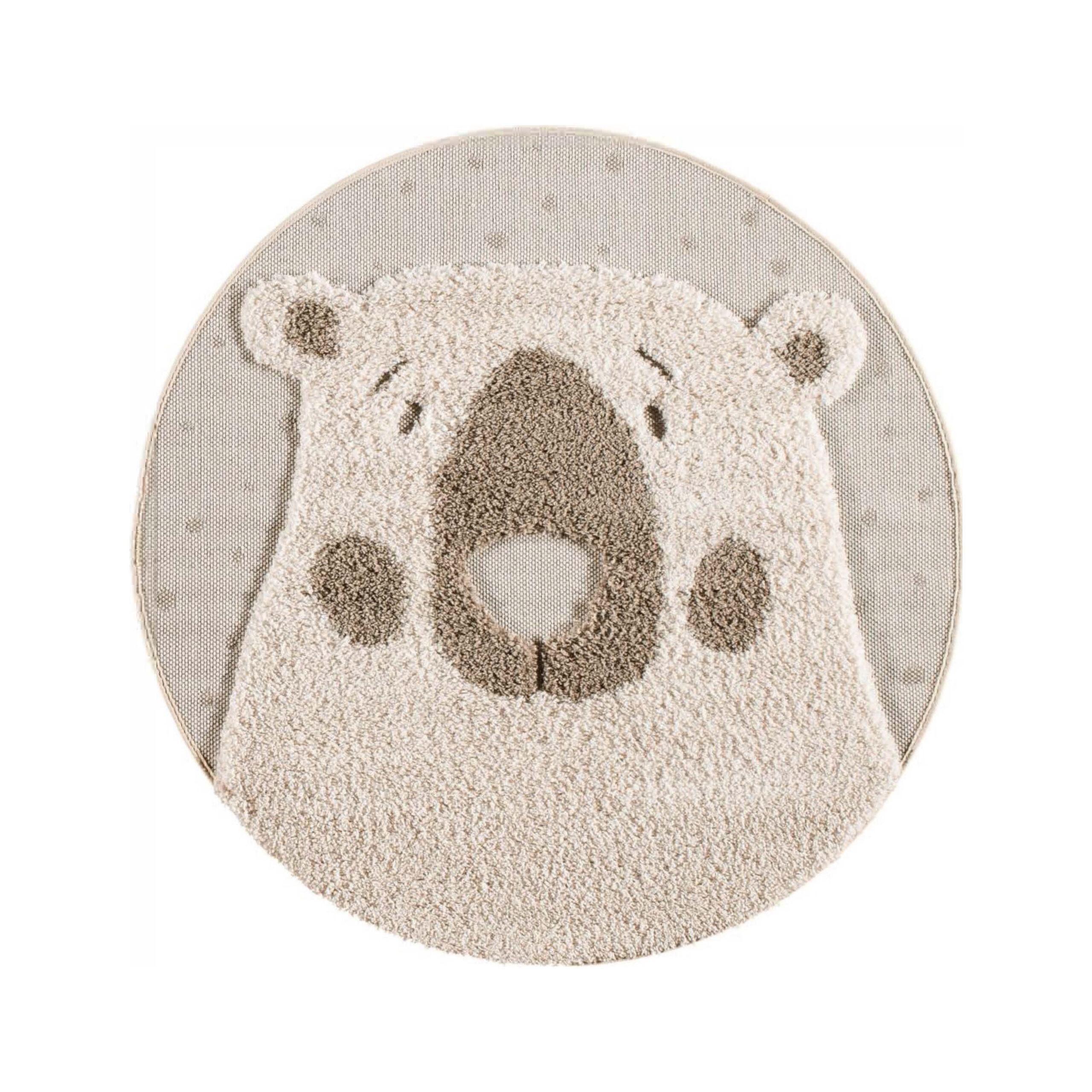 A round rug in soft ivory featuring a charming bear design, perfect for adding a cozy and playful touch to nurseries or living spaces.
