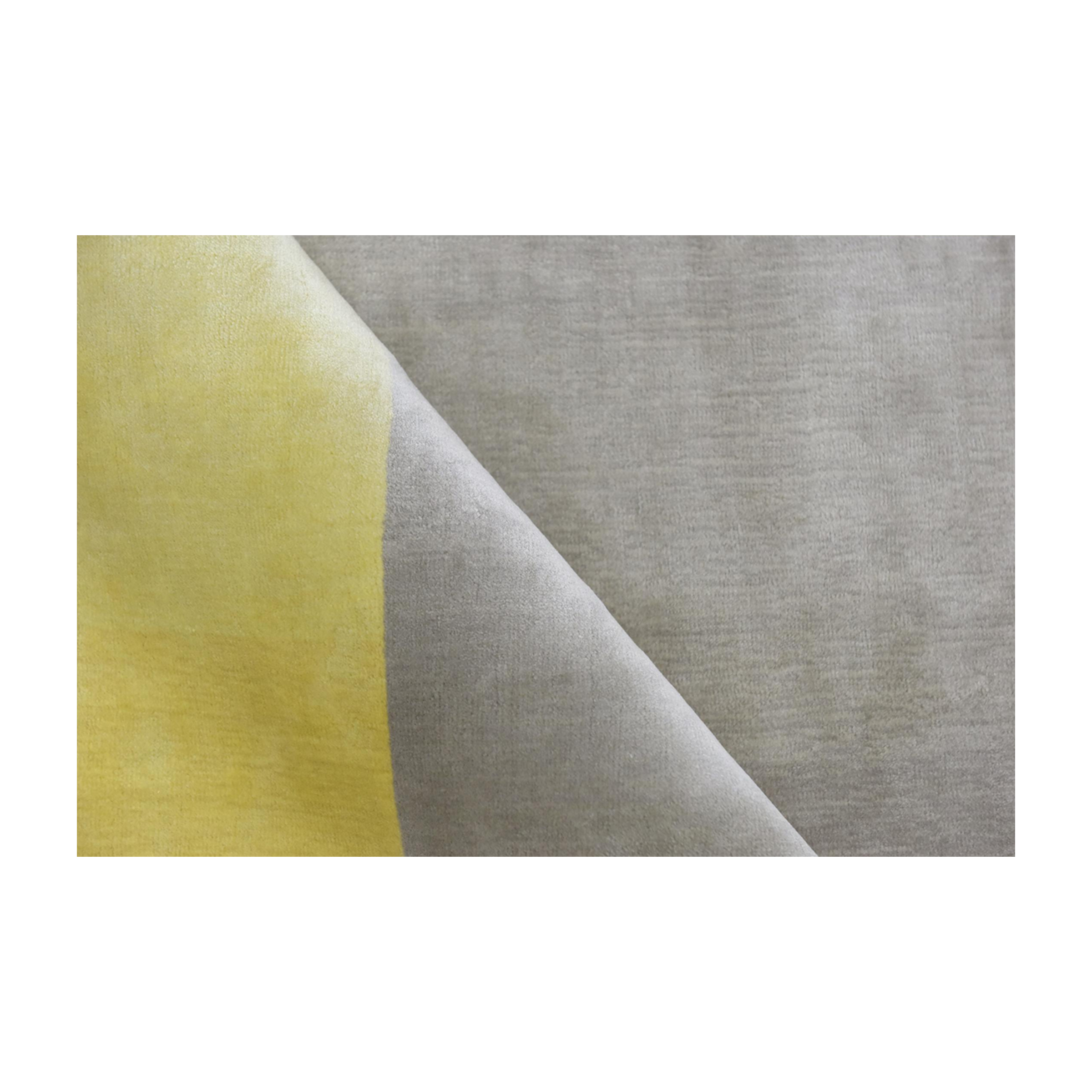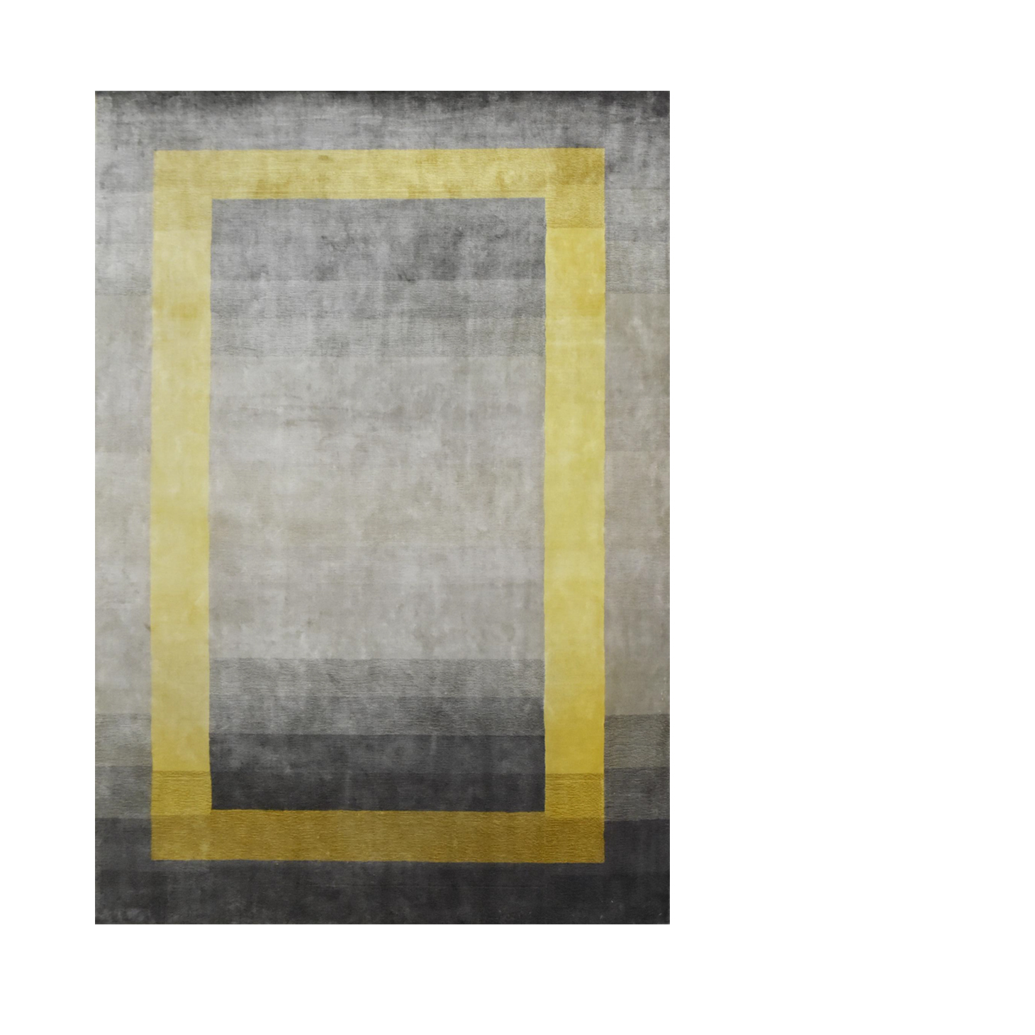 A sleek rug in shades of gray with a bright yellow border, offering a contemporary look that adds a touch of vibrancy and sophistication to any room.