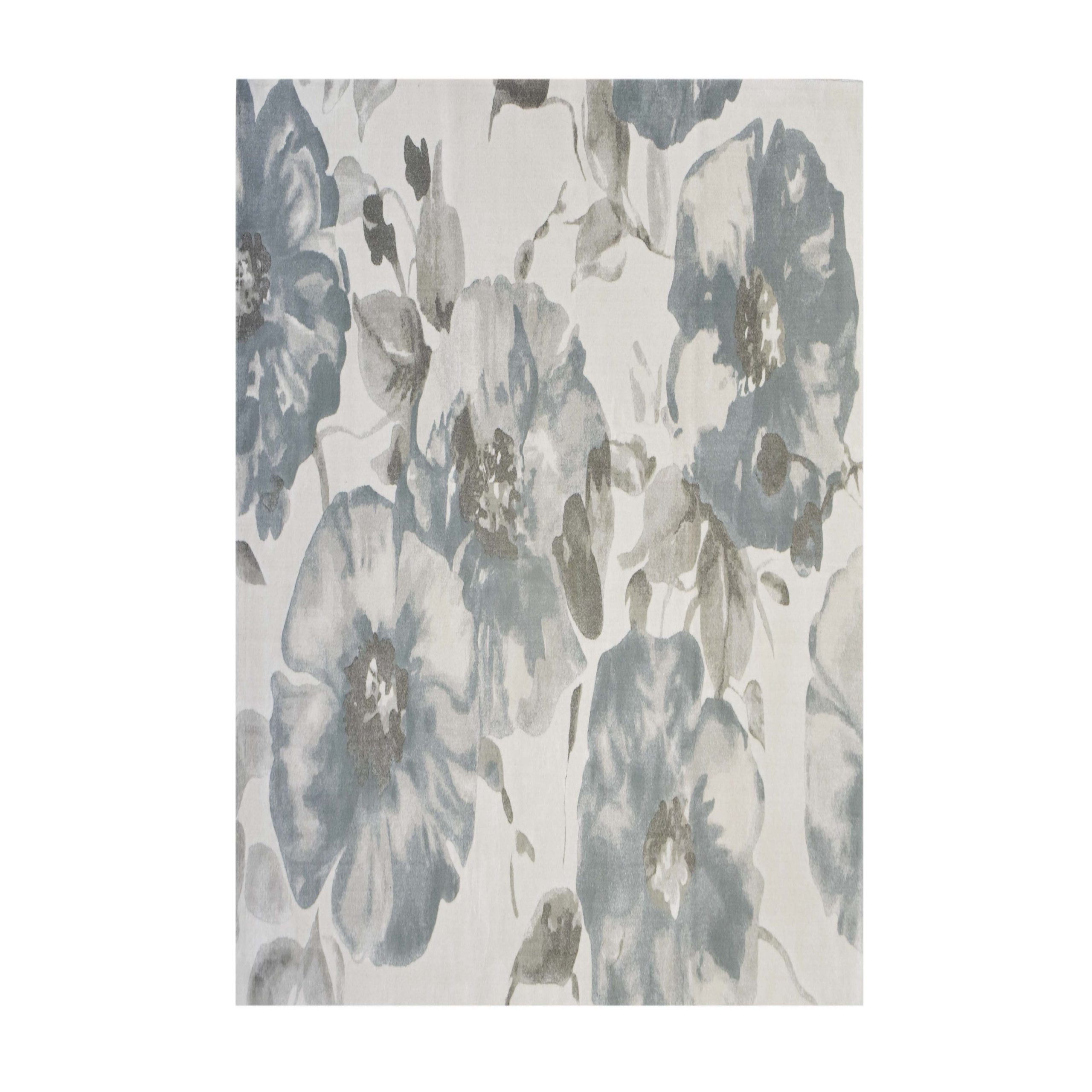 An elegant ivory rug featuring a delicate light pastel blue floral design, adding a touch of soft sophistication and charm to any room.