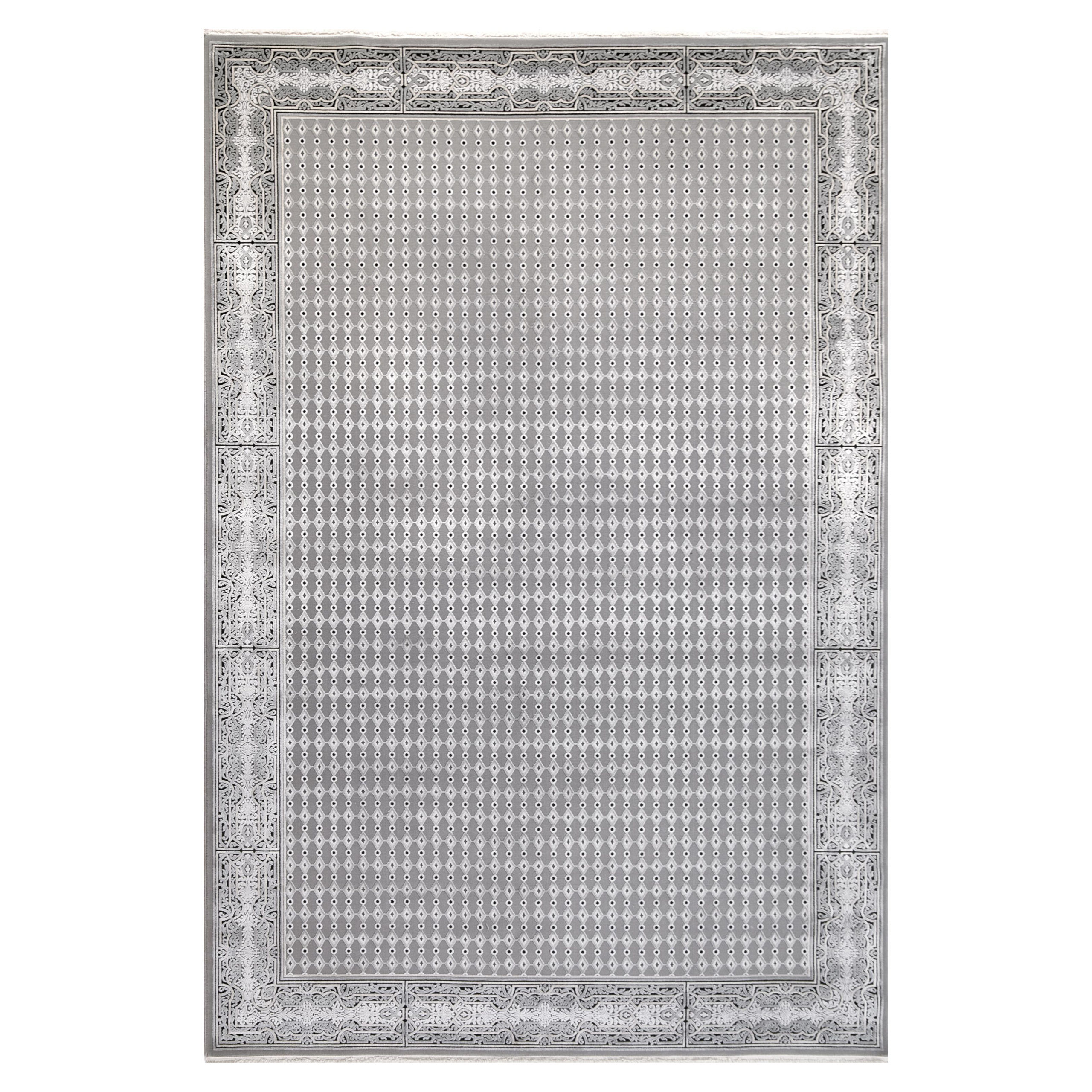 A gray rug with intricate patterns, offering a sophisticated and detailed design that adds depth and elegance to any room.