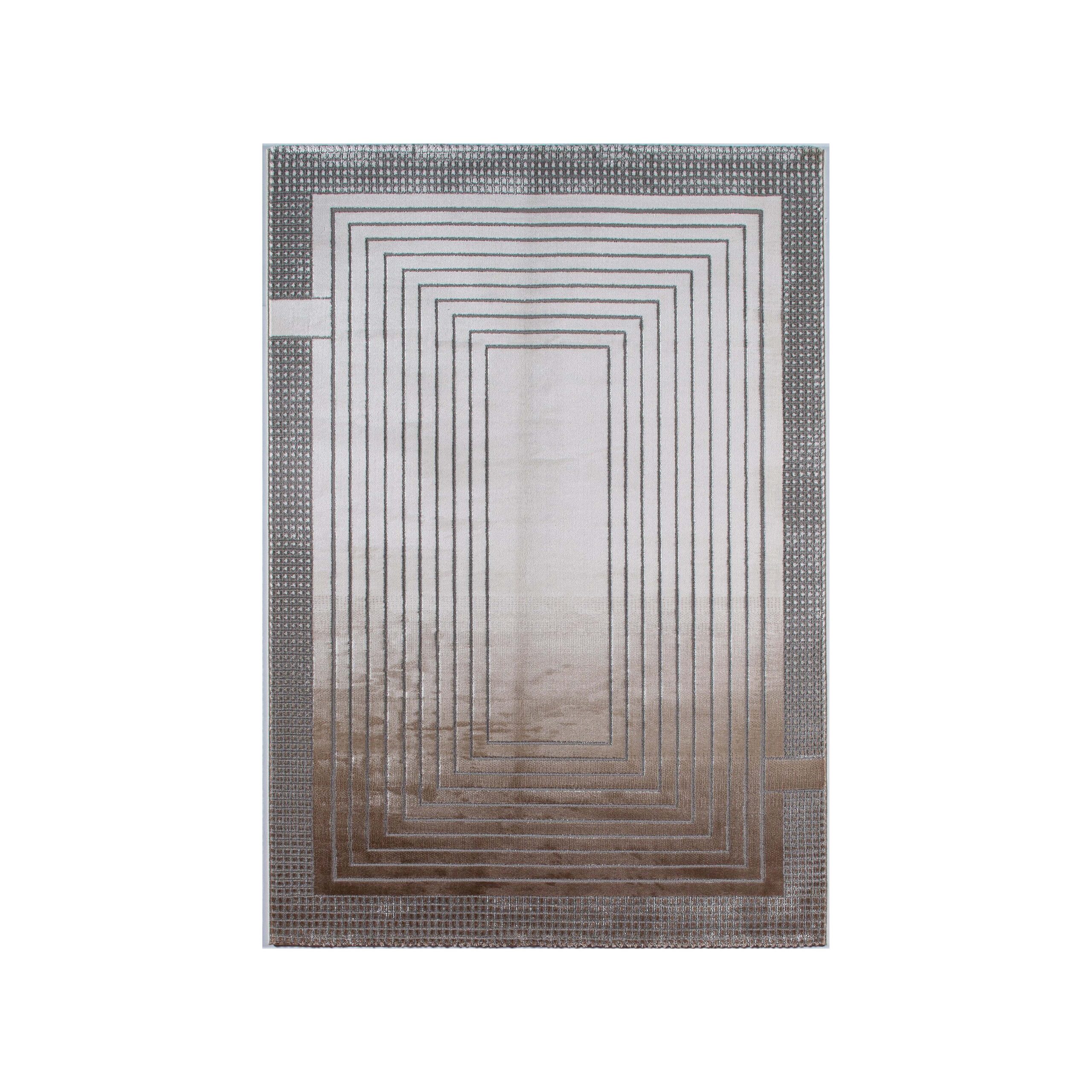 A rug in a harmonious blend of brown and gray featuring concentric rectangles, offering a sleek and modern design that adds depth and sophistication to any room.