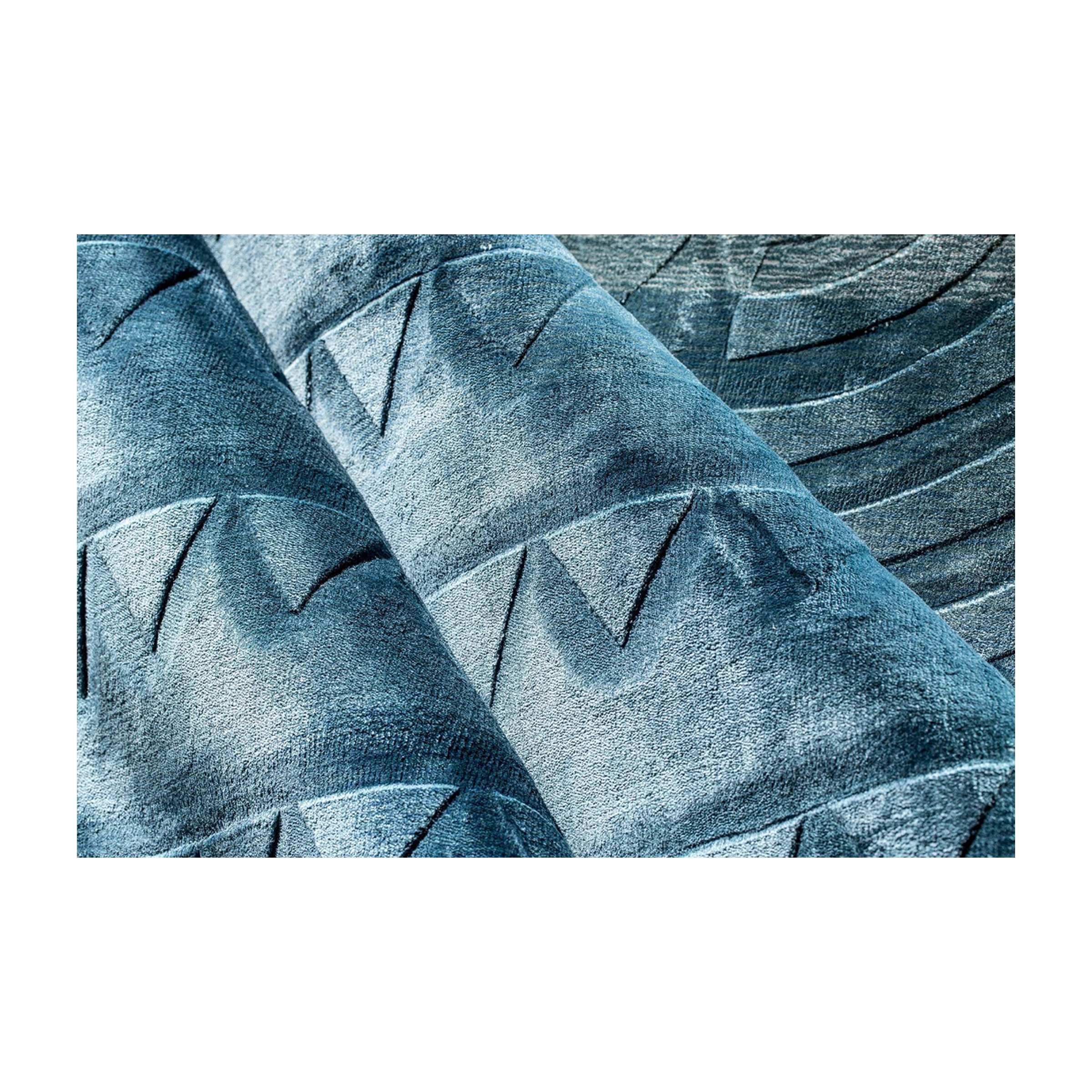 A soothing rug in pastel blue hues, adorned with flowing wave-like lines that evoke the peaceful rhythm of the ocean, perfect for adding a tranquil touch to any room.