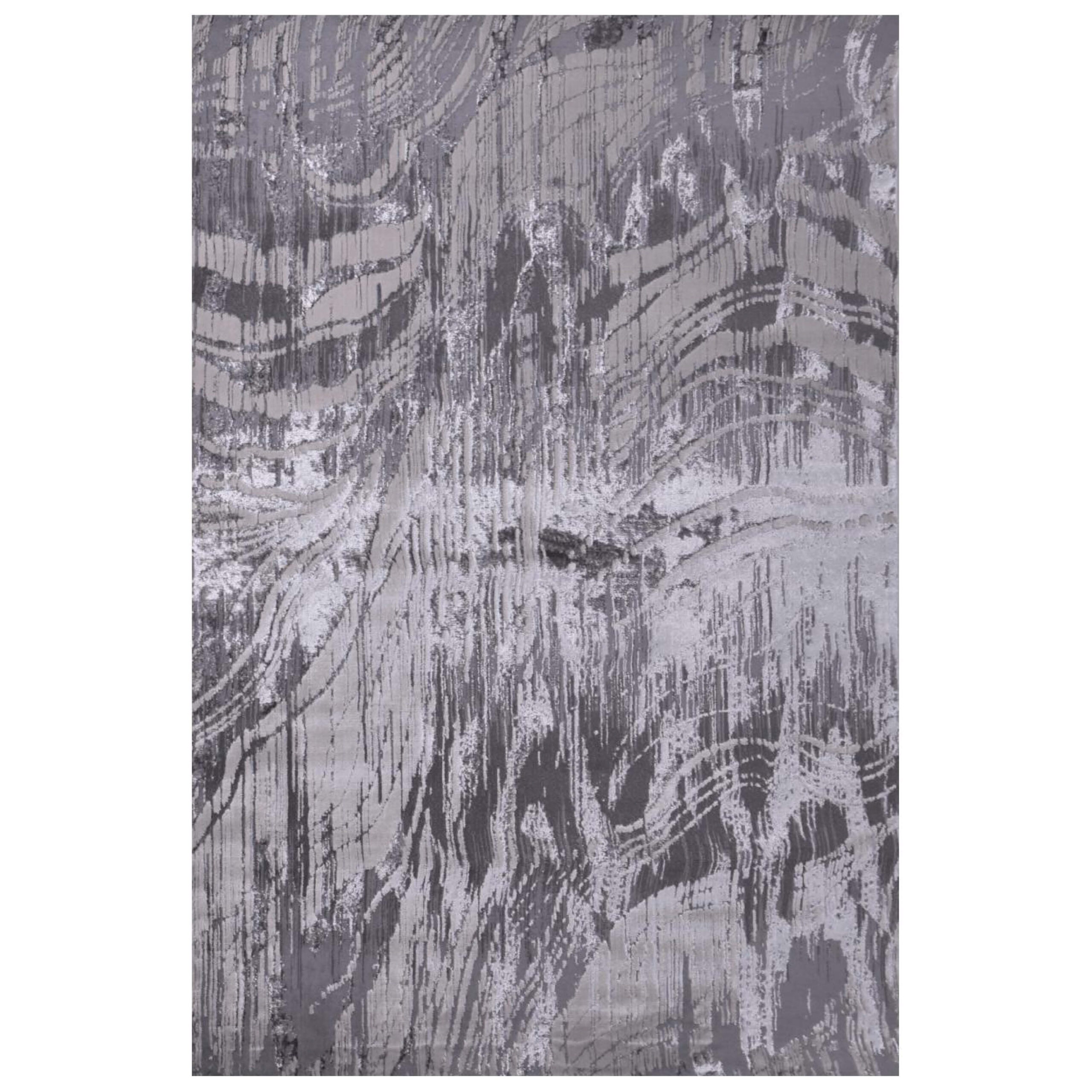 An abstract-patterned rug enhanced with silver splines, creating a dynamic and modern aesthetic.