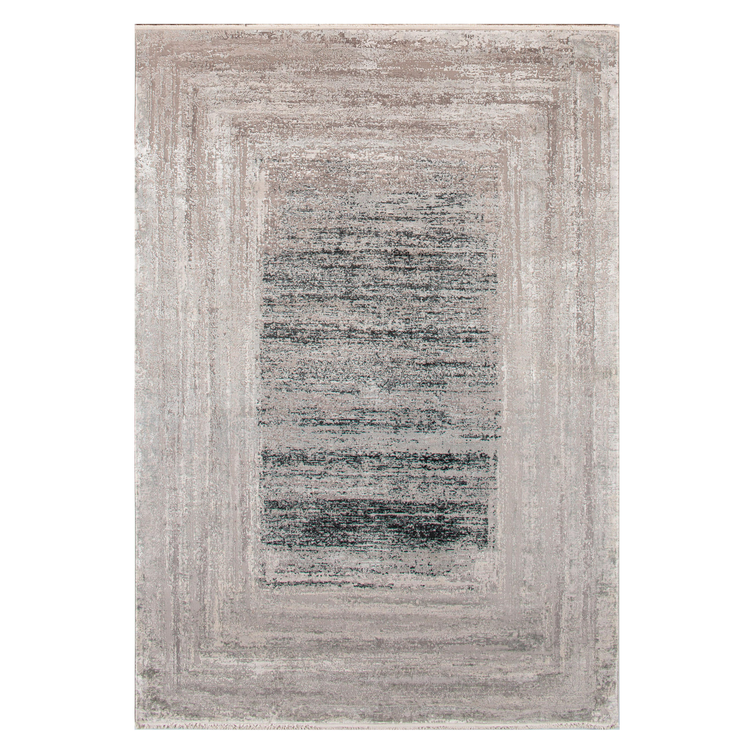 An ivory rug with silver and black accents, featuring a sleek and shimmering design that adds a touch of contemporary elegance to any room.