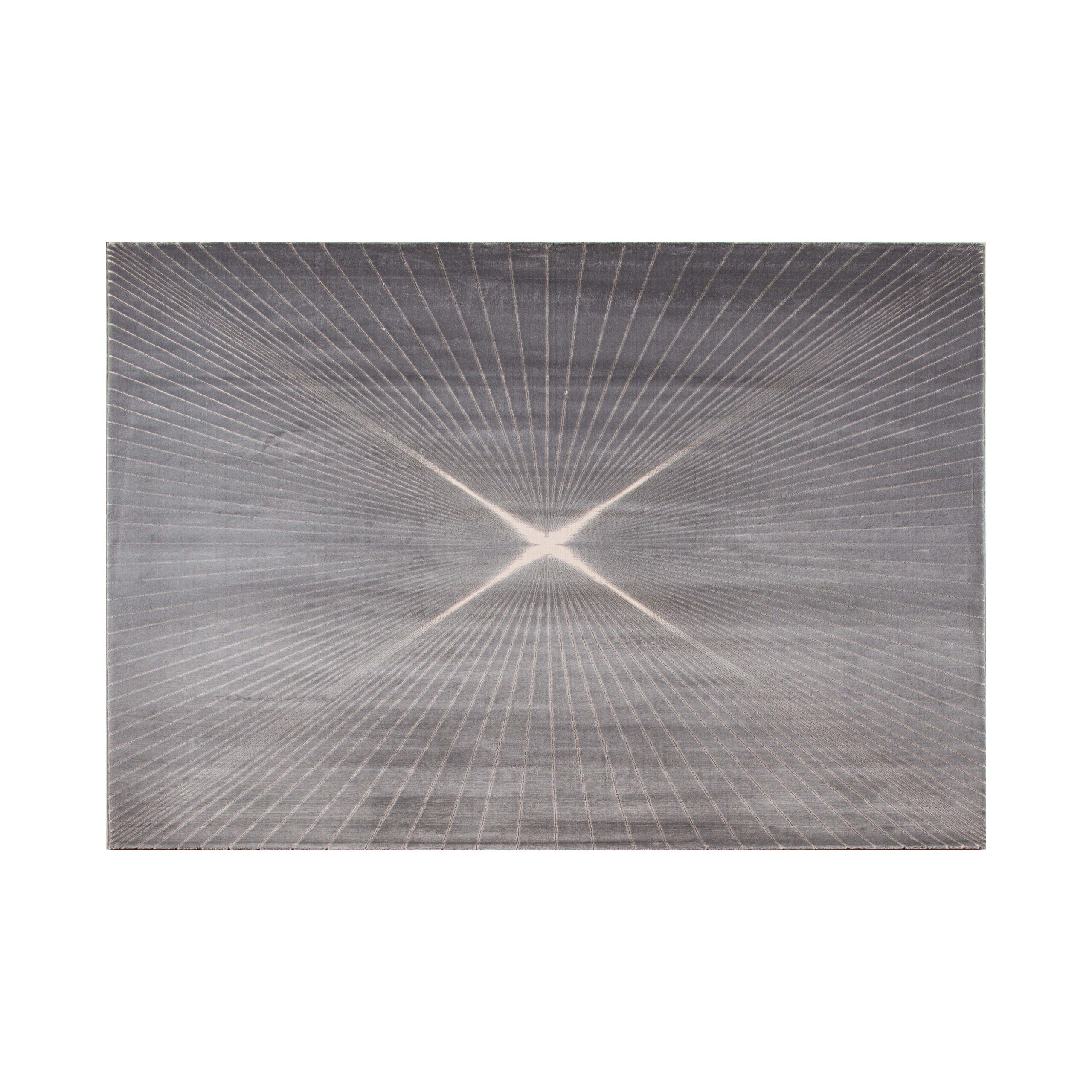 A gray rug featuring intersecting lines at the center with a subtle sparkle, offering a modern and eye-catching design that adds depth and elegance to any space.